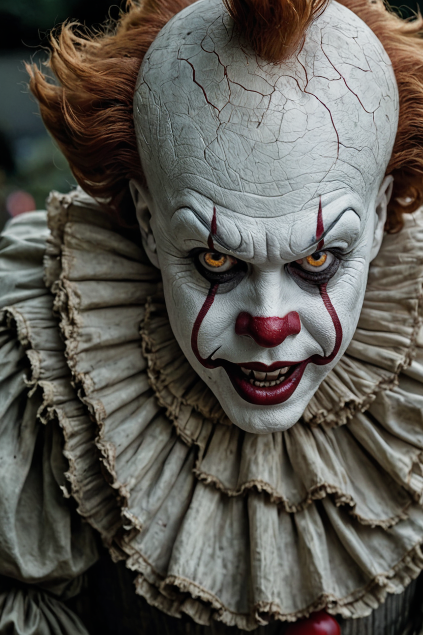 cinematic film still scary clown Pennywise,hellish,horror,uncomfortable mysterious atmosphere,8k,realistic detail,insanely intricate,upper body,angry . shallow depth of field, vignette, highly detailed, high budget Hollywood movie, bokeh, cinemascope, moody, epic, gorgeous, film grain, grainy