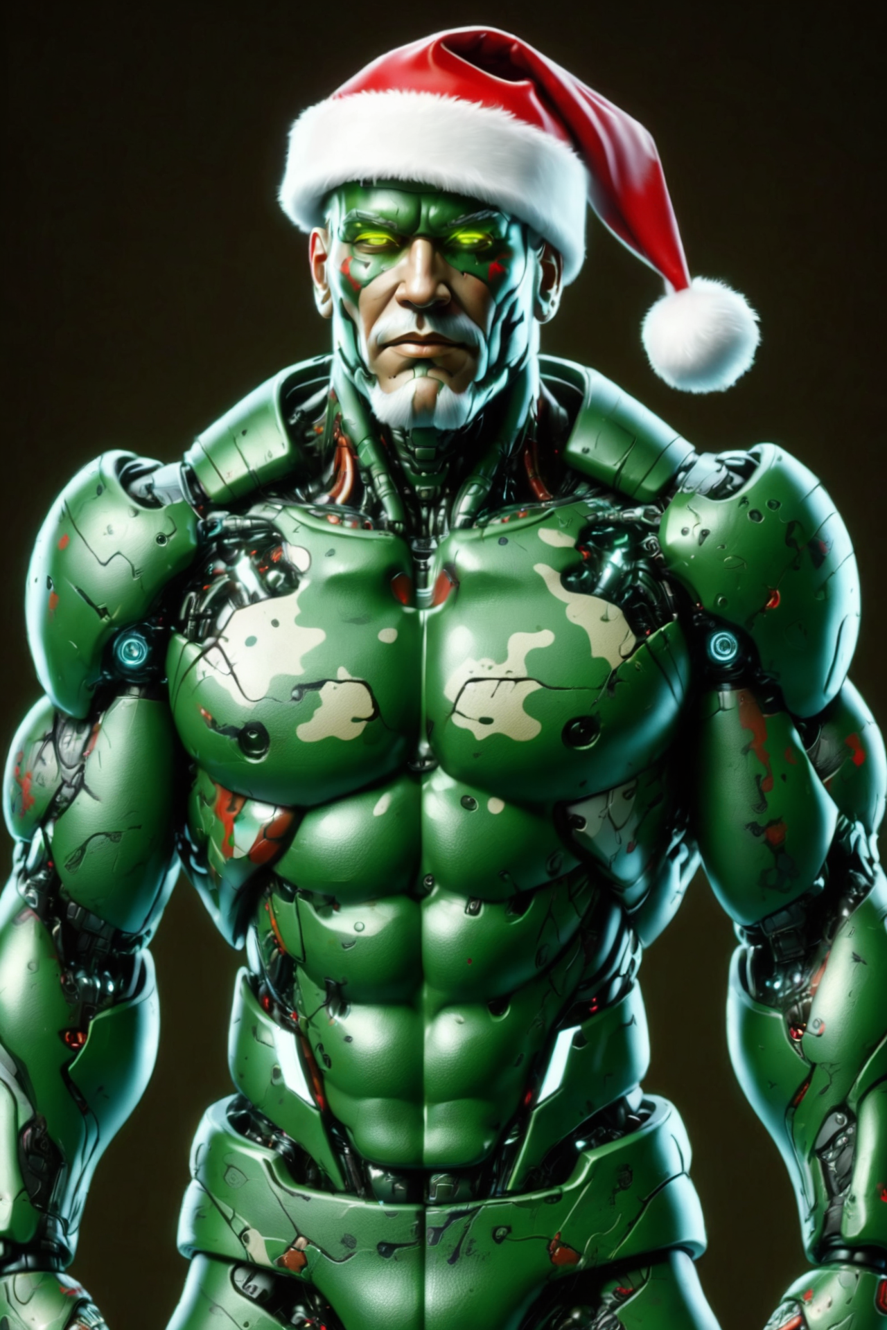 cyborg santa claus wearing green clothing and green hat, cyberpunk street, night, upperbody <lora:ral-camo:0.8> ral-camo <lora:just_another_Cyborg_LoRa_SDXL:0.8> (c1bo:1.2), (masterpiece:1.2), best quality, (hyperdetailed, highest detailed:1.2), high resolution textures