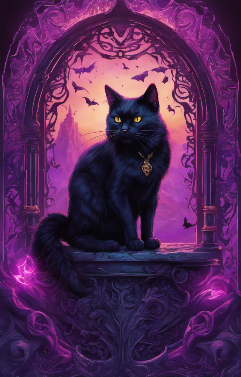 (dark magic), (grim), focus on a black cat, purple magic on background, ,(intricate details), (hyperdetailed), 8k hdr, high detailed, lot of details, high quality, soft cinematic light, dramatic atmosphere, atmospheric perspective