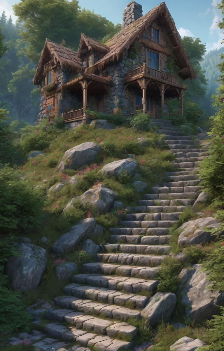 (dark magic:1.2), (grim:1.2) forest, bushes with thorns, stone stairs, small stone cabin, (intricate details), (hyperdetailed), 8k hdr, high detailed, lot of details, high quality, (colored:1.3)