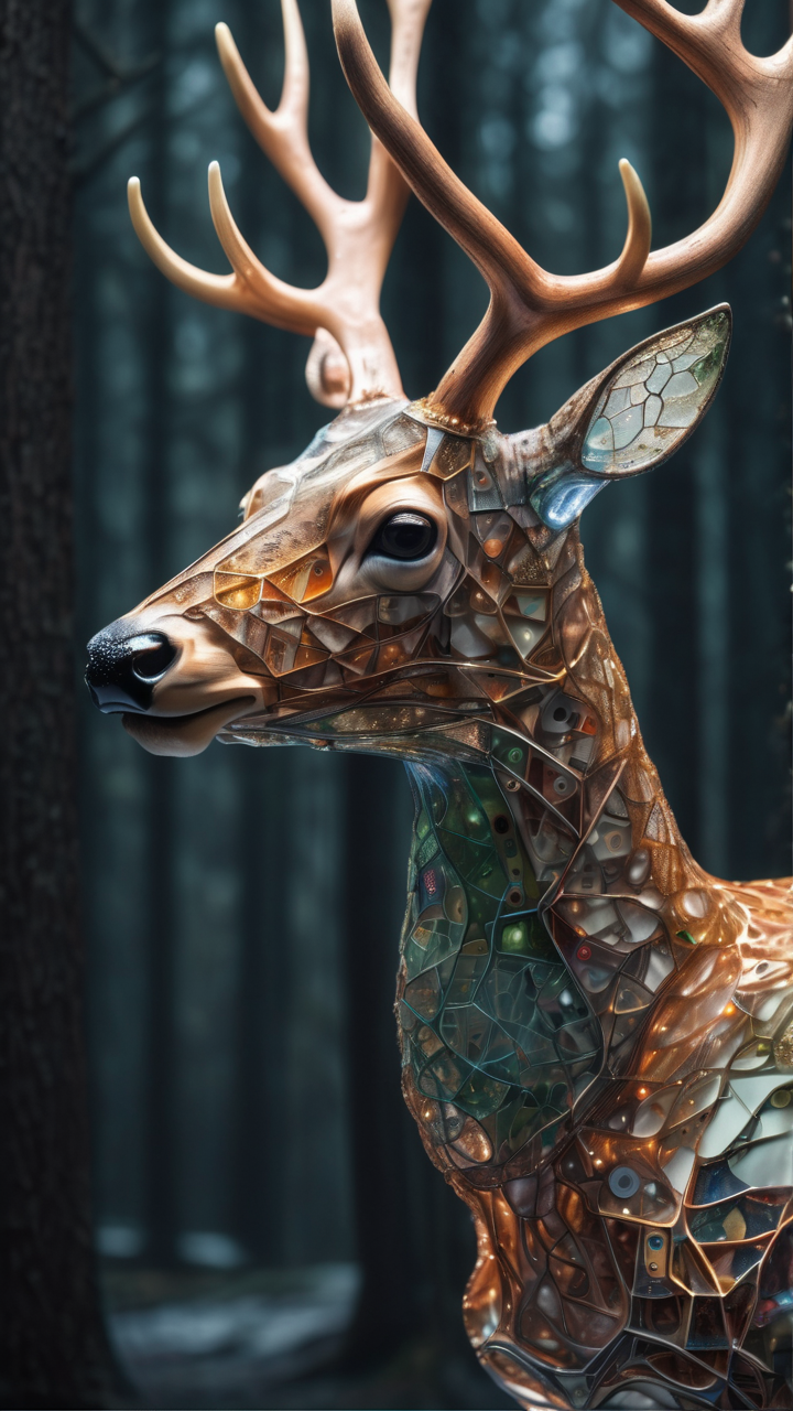 highly detailed photo of a transparent deer looking at viewer, circuit boards on skin, fog, dark forest, night, darkness, intricate technology details, microcomputer, contrasting shadows, cinematic lighting, realistic, photographic
