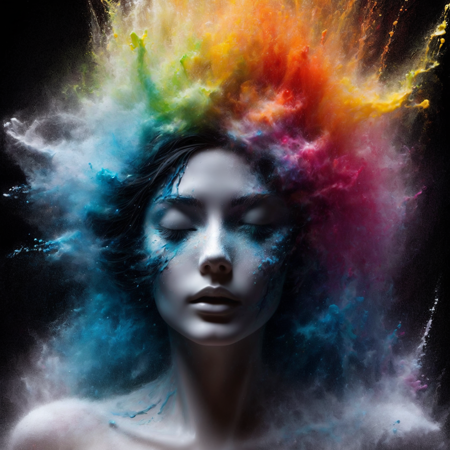 1woman colorful dissolves into into splashes <lora:dissolve:1> dissolve, particles, black background, (masterpiece:1.2), best quality, (hyperdetailed, highest detailed:1.2), high resolution textures