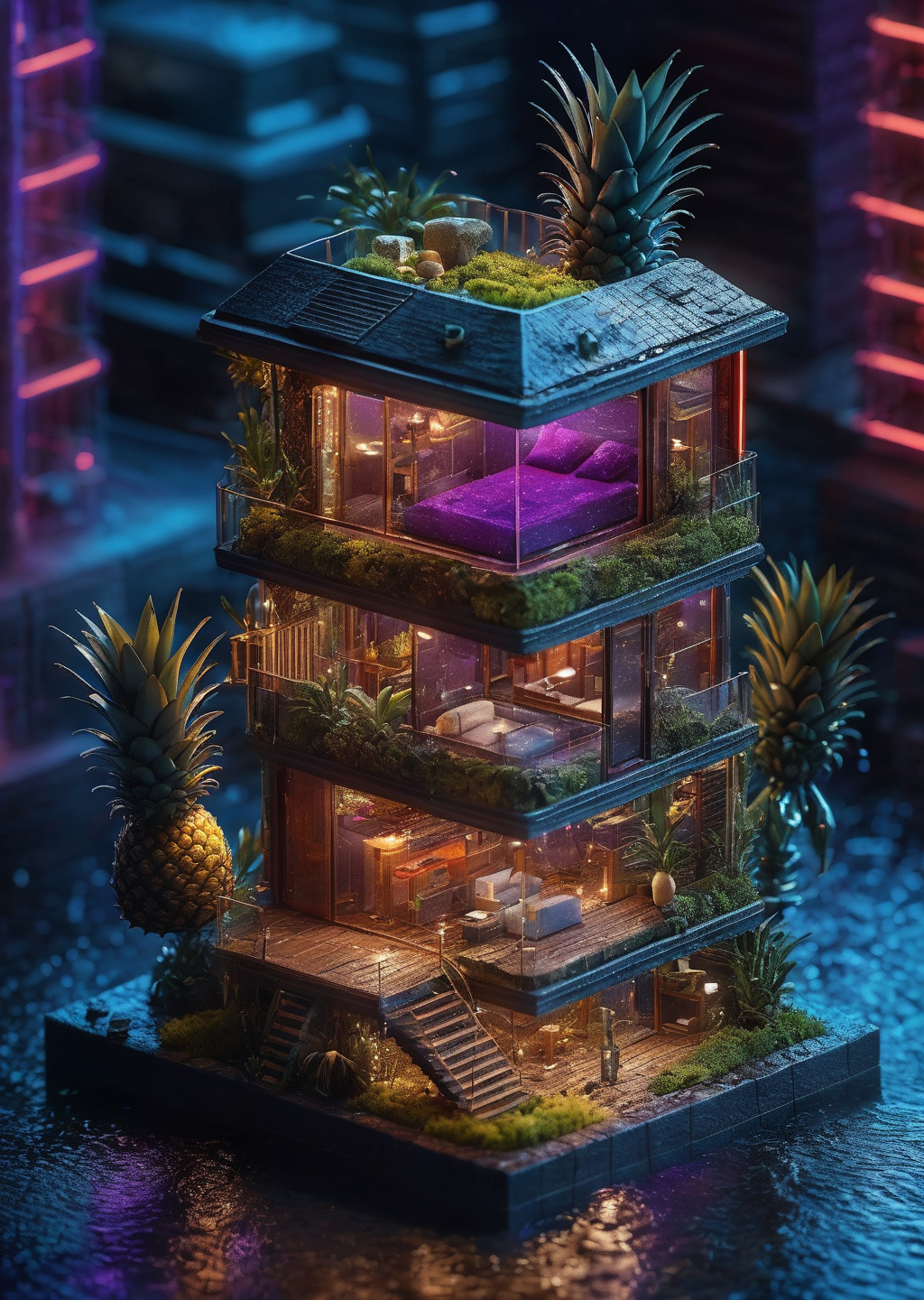 a miniature of a model of a pineapple house, under water, the promise of life unfolds in a microscopic realm, as roots stretch and shoots reach for the sky. water caustics, deep blue water. incredibly detailed, a microscopic photo, photorealism. (night sky), (stars), sci-fi, cyberpunk, cyberpunk city, fog, depth of field, neon lights, red neon lights, purple neon lights, blue neon lights, rain, masterpiece, detailed face, detailed background, extremely detailed cityscape background. award winning photo,nikon RAW photo,8k, Fujifilm XT3,masterpiece, best quality, realistic, photorealistic, ultra detailed, raw photo. <lora:add-detail-xl:2.2> <lora:Microverse_Creator_sdxl:1.0>