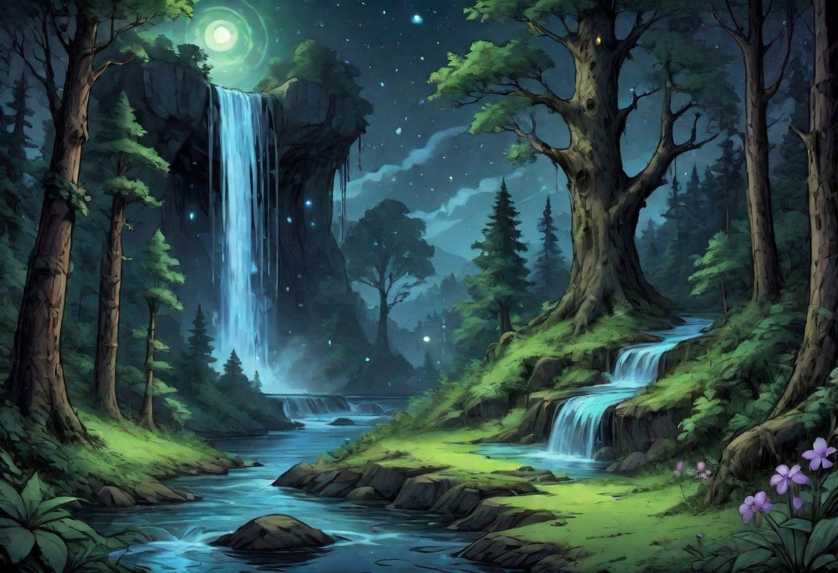comic book art, epic fantasy, splash art, a mystical magical lush forest, will-o-the-wisps, sprites, fairies, (magic lights, magic effects, magic sparkles, magic swirls:1.2), magical flowers, a waterfall, glitter, peaceful, serene, (nighttime:1.5)