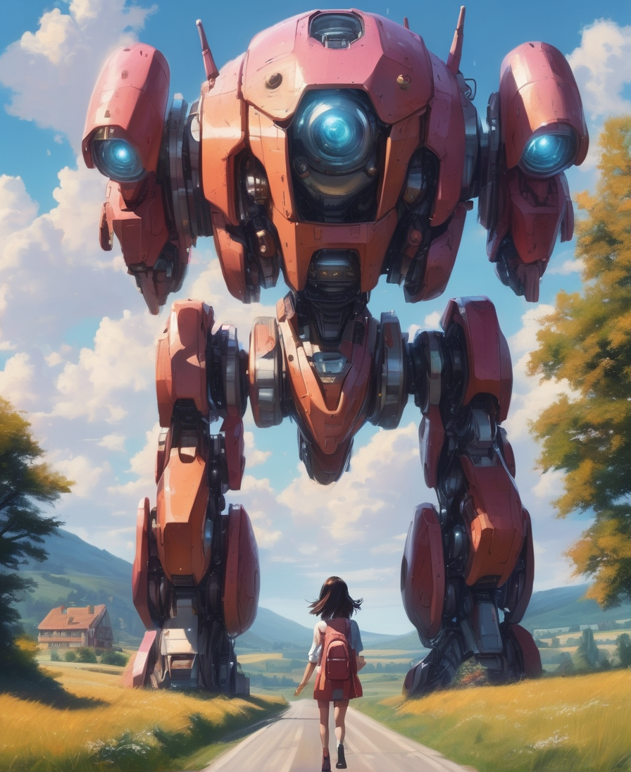 girls on a journey, huge, very large countryside with a street that doesn't show the end, (two girls on a journey from rear:1.2), (high quality), huge robot monster on the view far away,
