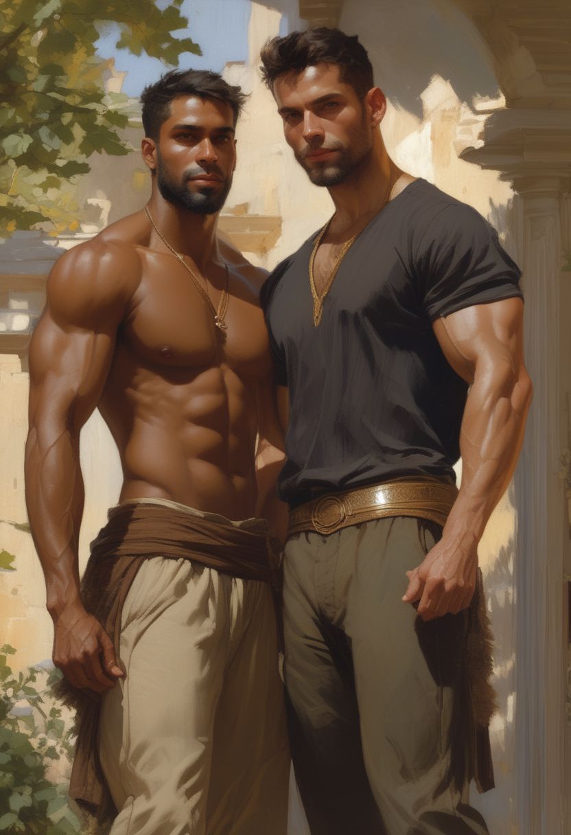 an extremely detailed masterpiece (by Daniel F Gerhartz|Guillaume Seignac|Maximilian Pirner:1.9). soft colors, muted colors, flat colors, dull colors, soft focus, action shot. two (very-hairy:1.9), (shirtless:1.8), bearded men named R and M. R is a slim, (athletic:0.6), tall, (medium-light-brown-skinned:1.6) brazilian man with very-short black hair, and a perfect beard, who stands (six inches taller than M:1.5). M is a short, incredibly muscular, (dark-tan-skinned:1.6) iraqi man with short brown hair, a short beard, and square pectorals. R and M are both unbelievably handsome, rugged, masculine, manly men in their early-30s. a joyful, romantic, modern-day, summertime scene in which both R and M are smiling, joyfully expressing their love to one another.