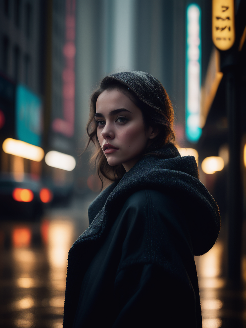 candid photo of a pensive young woman, wearing winter clothing, dark features, waiting patiently, upper body, rainy city street corner, cinematic lighting, eye level, Leica with a 50mm lens, Cinestill 800T, prominent grain, bokeh, in style of Paolo Roversi,