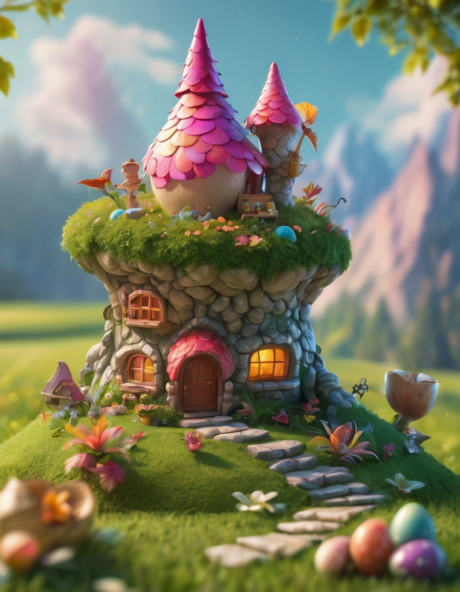 a fairy house sitting on top of a lush green field, polycount contest winner, fantasy art, dragon eggs, miniature cafe diorama, behance 3d, newly hatched dragon, full color illustration, a beautiful artwork illustration, doll house, detailed set design
