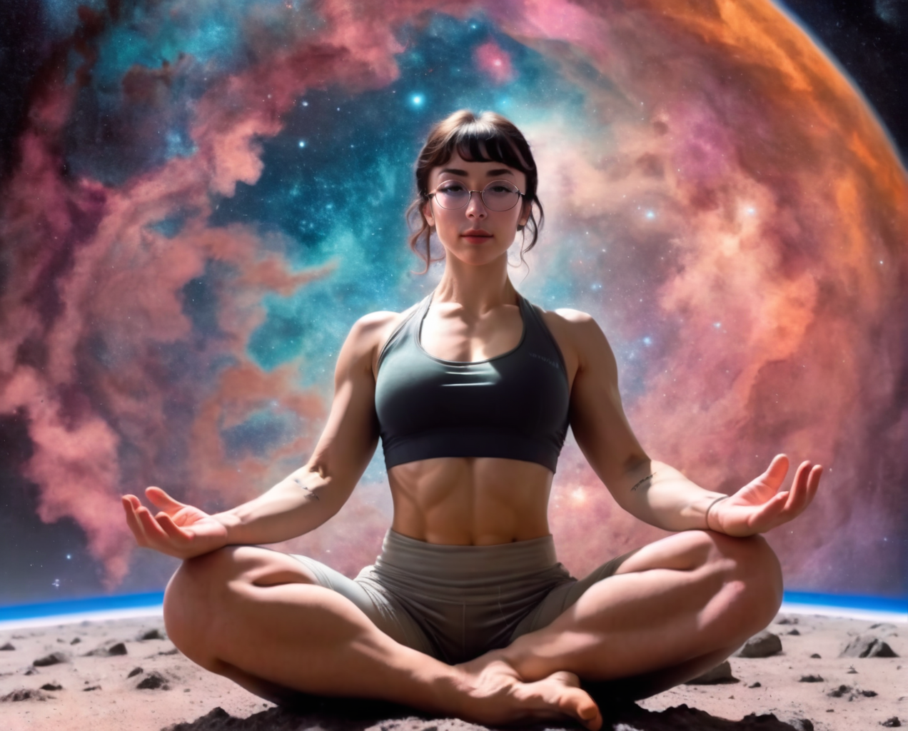 <lora:XLBPDadapt-072723:1> l34nb33fp4tty, wearing glasses and a workout outfit, (meditating in space surrounded by a beautiful nebula), muscular, perfect beautiful face, ((perfect hands)), in the style of Hayao Miyazaki, Alphonse Mucha, Frank Frazetta