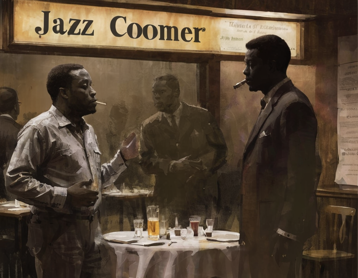 <lora:crmu:0.6>crmu, man standing next to man sitting at table with silhouette of man in background and text that says "coomer", jazz club,