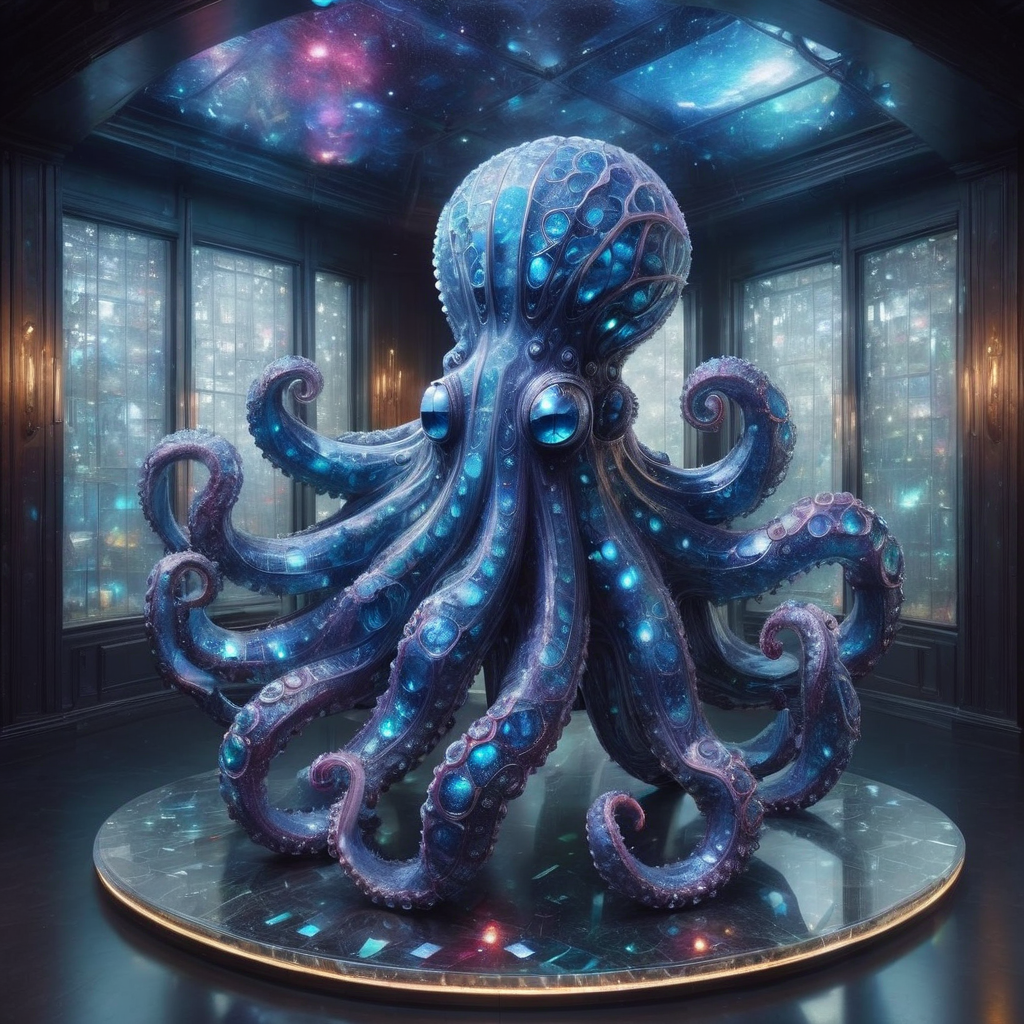 nebula octopus,marine life BREAK <lora:bgst:1>bgst holographic augmentation visualization chamber, multi-tool,candles,mermaid scales,mysterious artifact,traps and snares, russian tapestry weave tapestry,porcelain tiles,breccia stone, fluorescent tubes,sunlight through windows, wall washers, cyberpunk, sci-fi