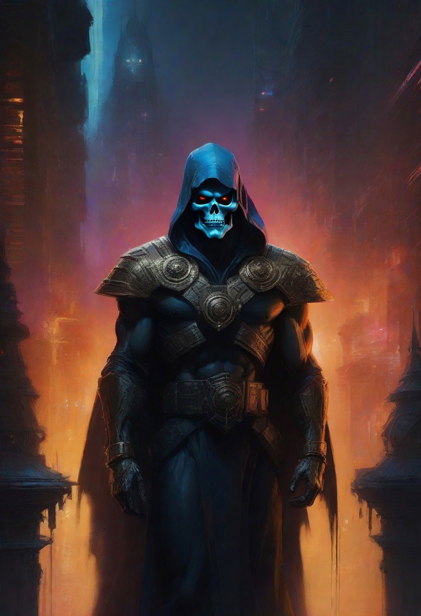 close-up Exquisite ultra-detailed digital art, showcasing Skeletor arriving at the Shadow Kingdom beyond the black veil in the atmospheric style of Jeremy Mann, Charles Dana Gibson, Mark Demsteader, Paul Hedley, enhanced by an impressive black shadow castle, all framed within a cinematic impressionistic painting, dramatic, mysterious characters, sleek, genuine leather texture, dark theme, vivid contrasts, detailed contours, subtle chiaroscuro, breathtaking surreal masterpiece, foreboding background, dark color palette, dark melting background, insane detail sharp focus, vivid colors, cinematic, 4k, epic Steven Spielberg movie still, sharp focus, emitting diodes, smoke, artillery, sparks, racks, system unit, motherboard, by pascal blanche rutkowski repin artstation hyperrealism painting concept art of detailed character design matte painting, 4 k resolution blade runner