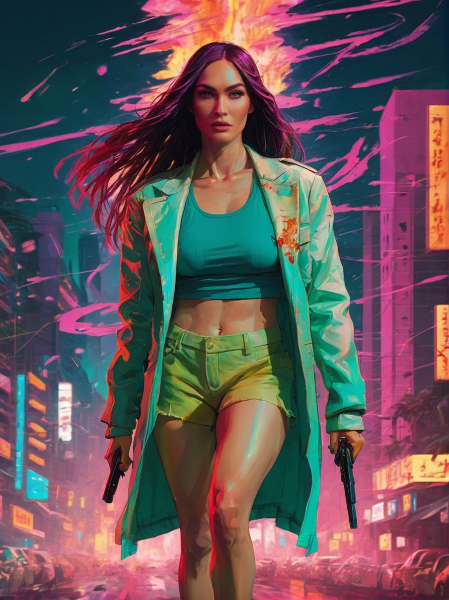 a (full height photograph:1.2) of (ohwx woman:1.3) , (by Alyssa Monks:1.1), beautiful lighting, sharp focus, 8k, high res,Masterpiece, Nikon Z9, Award - winning photograph , athletic body,As Jean Grey in her green and gold Phoenix attire, unleashing her telekinetic powers, creating an aura of flames around her, floating above a devastated landscape, locked in a fierce battle with a cosmic entity, intense action, vivid colors, epic composition, hyper-detailed, high-resolution, masterpiece, powerful display of her abilities. ,<lora:MeganFox:1> in the style of Neon Graphics - "Hotline Miami"