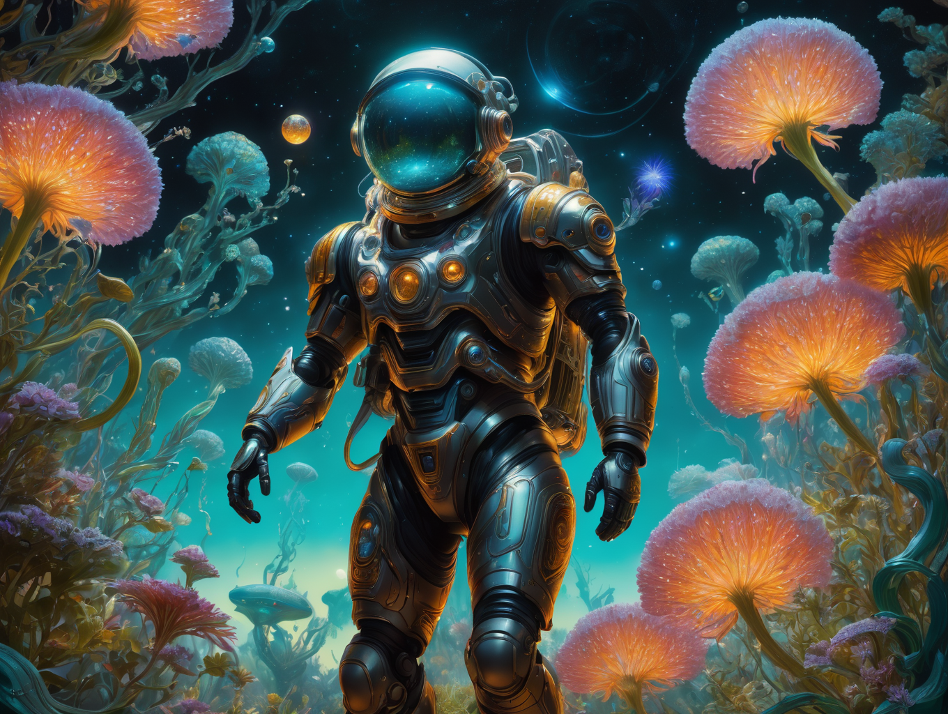 An image of a mesmerized astronaut encountering alien life form, illuminated by bioluminescent flora, extremely detailed, ultra realistic, 10k high resolution, in the style of gouache, graffiti art, glass blowing, influenced by Art Nouveau, Dadaism, and Futurism, art by mooncryptowow, <lora:wowifierXL:0.5>
