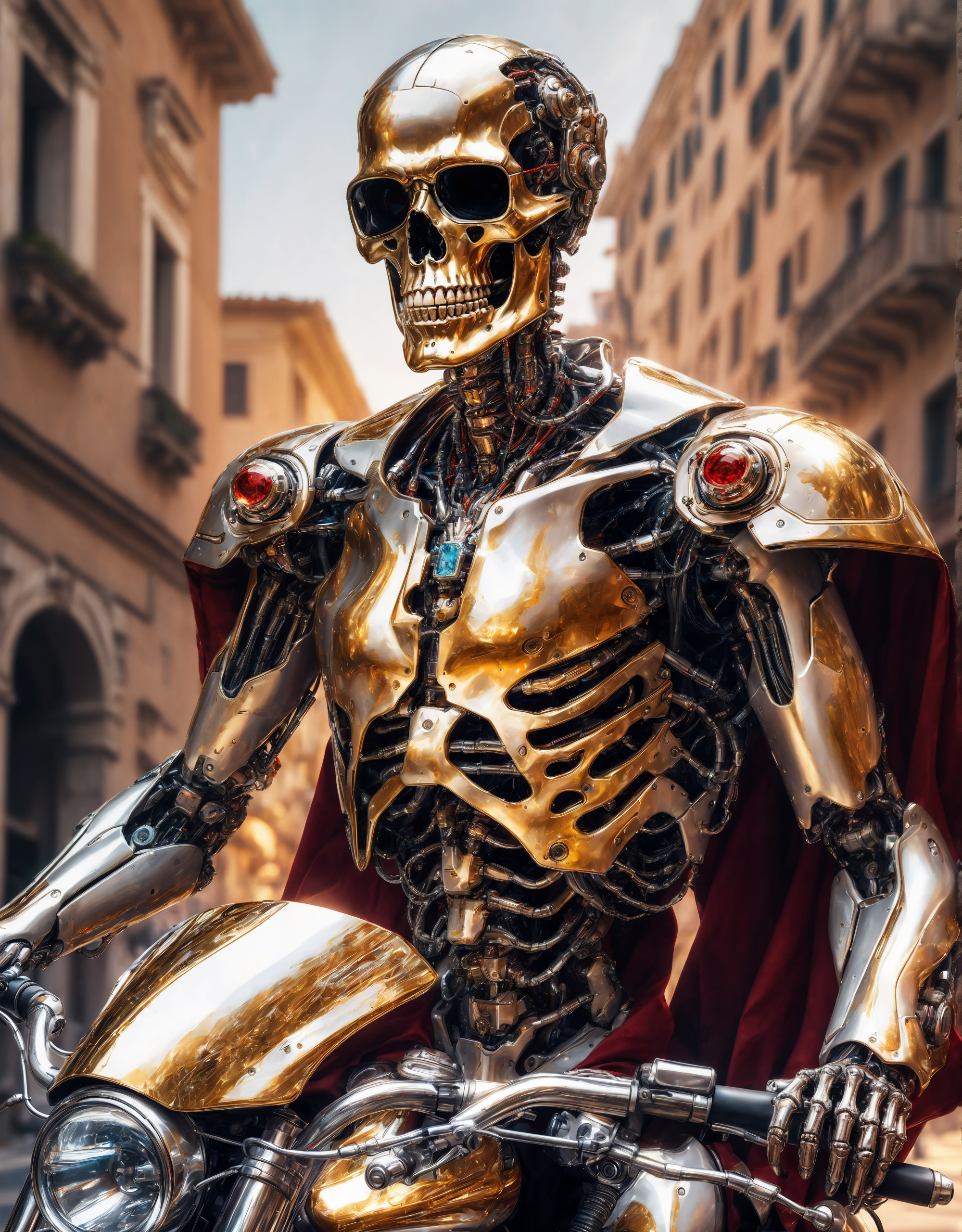 photo, 8k portrait of beautiful cyborg skeleton pope driving a motorcycle, papal hat on head, jewellery, gemstones, spine, rome in the background, golden hour, intricate, elegant, highly detailed, majestic, digital photography, art by artgerm and ruan jia and greg rutkowski surreal painting, gold, white, red, metal, ceramic, broken glass, (masterpiece, sidelighting, finely detailed), hdr, realistic, high definition, (cyborg style), (cyborg), (android)