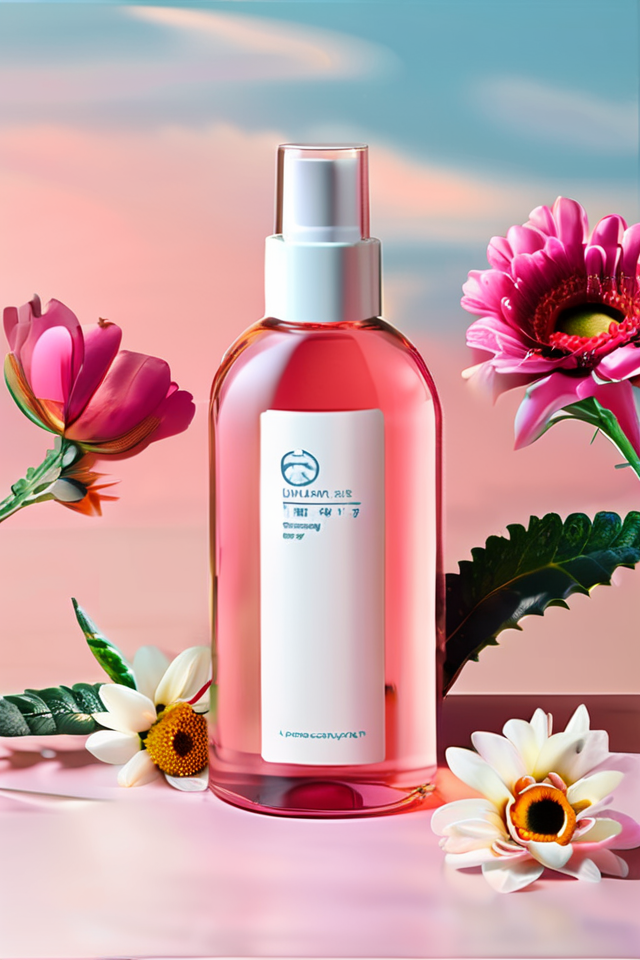 a bottle of liquid sitting next to a bunch of flowers on a table with a sky background and a pink background,productscene<lora:productscene:1>