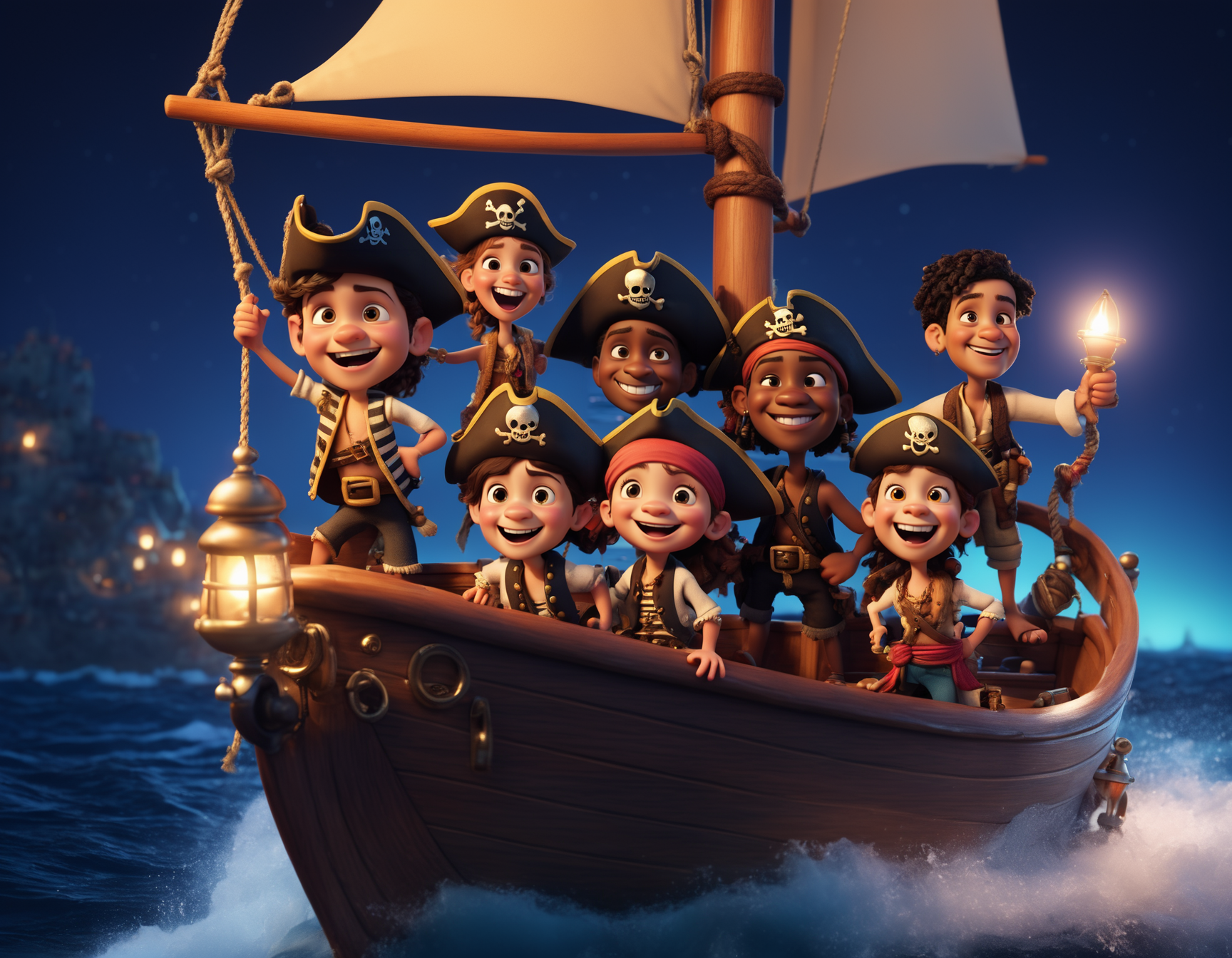closeup photography , a crew of diverse tiny pirates caricatures, happy, in a tiny sailboat, ocean, night time, pixar style, octane engine