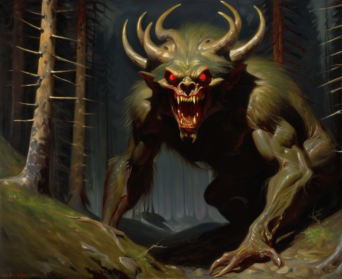 Painting by Akseli Gallen-Kallela of an evil forest creature, oil on canvas masterpiece