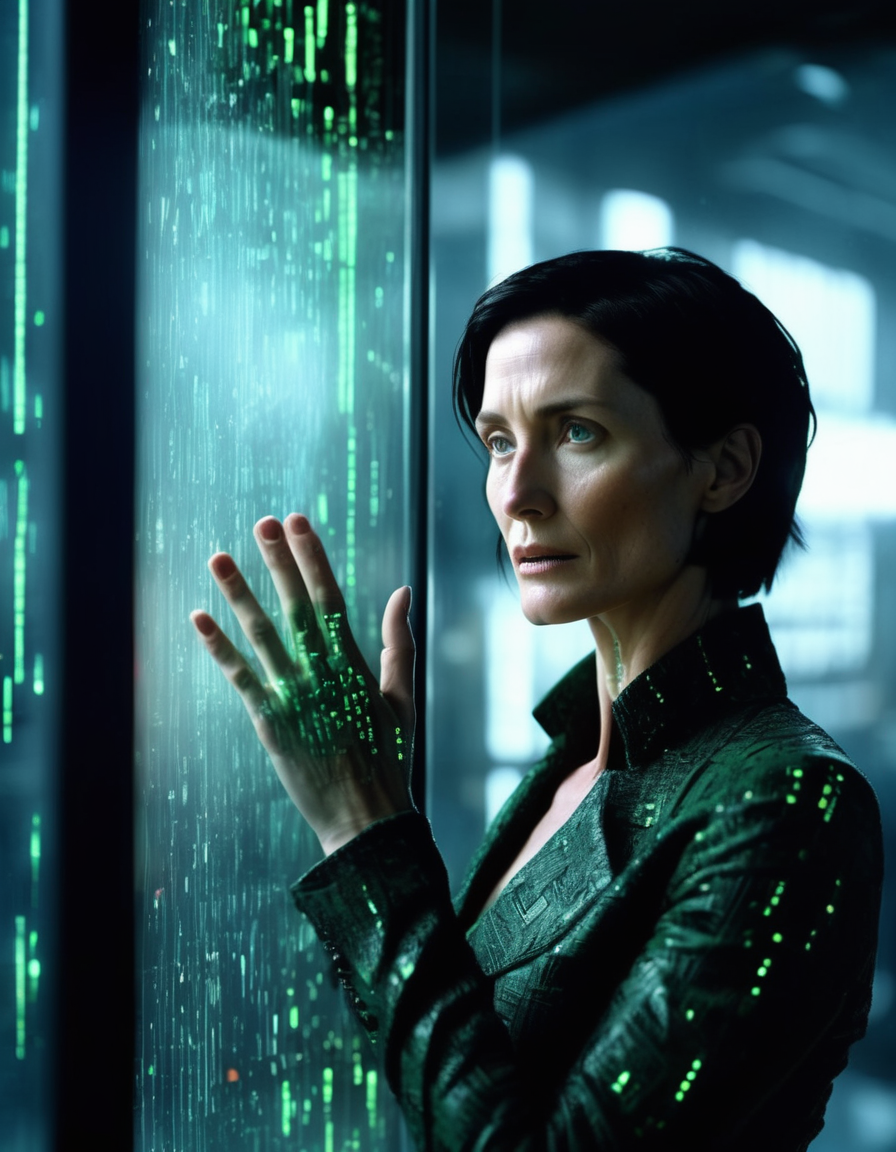 Cinematic photo full body, [:(1 woman glitching, falling green matrix code glyphs, shattering skin, computer glitch effect:2.1):0.15] cyberpunk Trinity (Matrix), Carrie-Anne Moss, short hair, inside a telephone call box, (facing the viewer:1.3), (right hand to the viewer against the glass:5), (left hand holding corded telephone receiver next to ear:2.0) . 35mm photograph, film, bokeh, professional, 4k, highly detailed . 35mm photograph, film, bokeh, professional, 4k, highly detailed