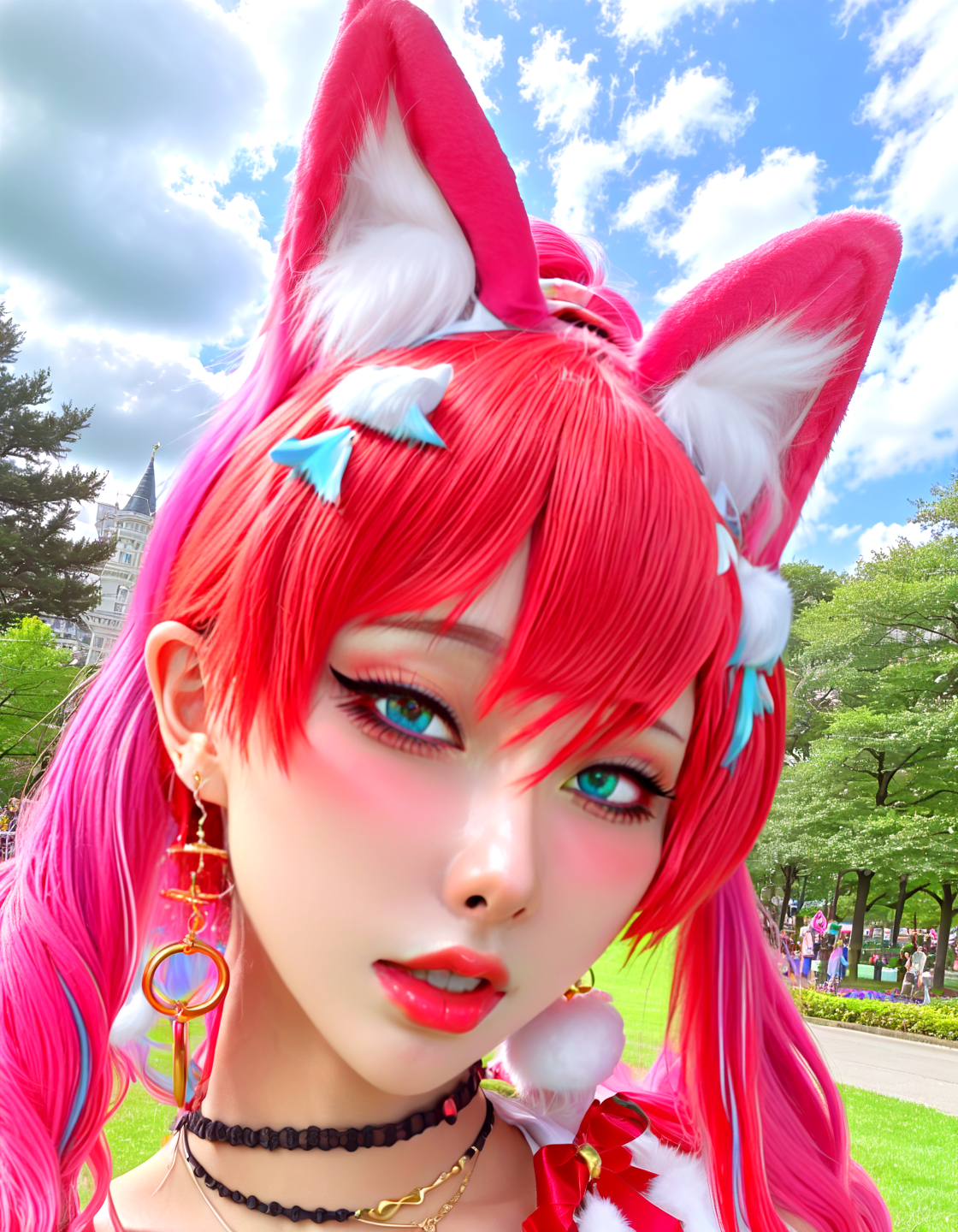 Ankama vivid animation style HaneAme, animal ears, beautyfull detailed eyes, colured hair, choker, jewelry, looking at viewer, ponytail, cat ears, long hair, necklace, bangs, hoop earrings, kissing mouth, candy cotton clouds, fantasy world, walking in the park,,. Vibrant colors, expansive storyworlds, stylized characters, flowing motion