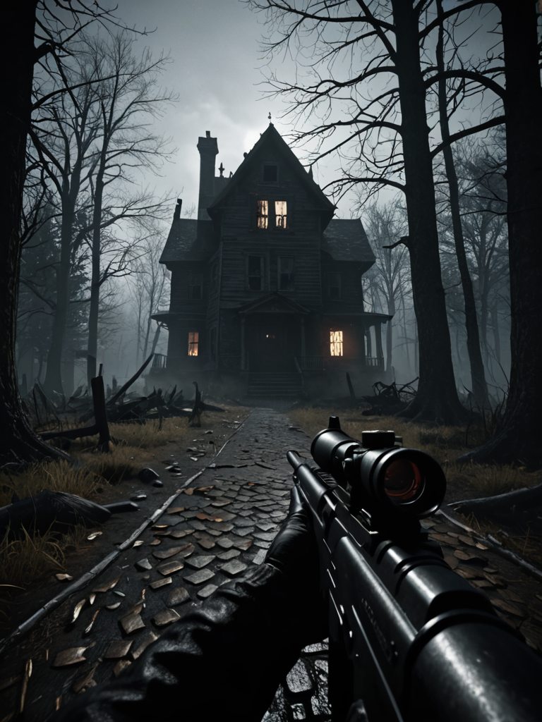 Horror-themed photorealistic first person shooter video game screenshot, epic scene . Eerie, unsettling, dark, spooky, suspenseful, grim, highly detailed