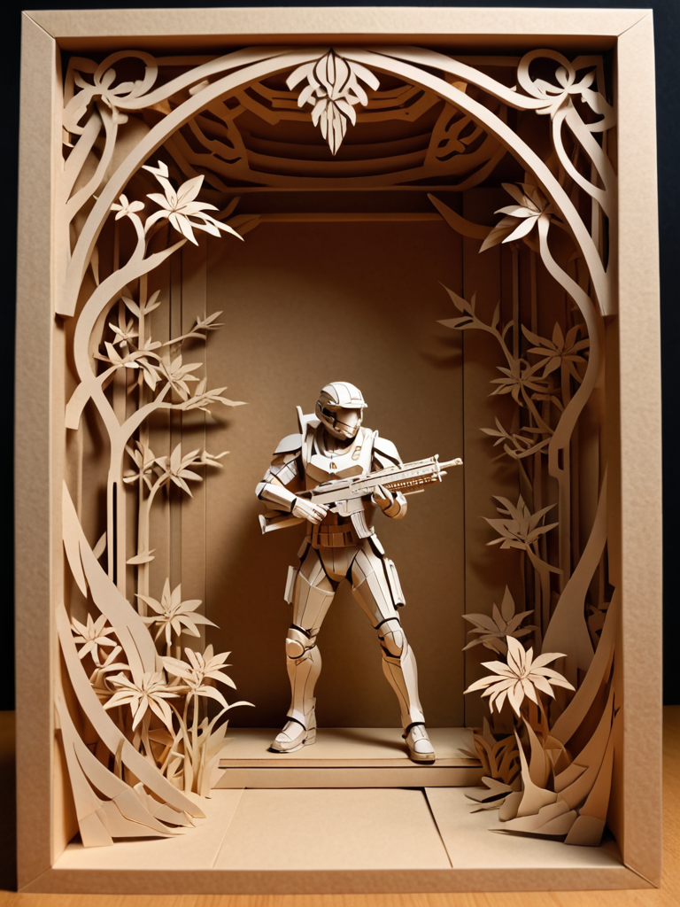 Kirigami representation of photorealistic first person shooter video game screenshot, epic scene . 3D, paper folding, paper cutting, Japanese, intricate, symmetrical, precision, clean lines