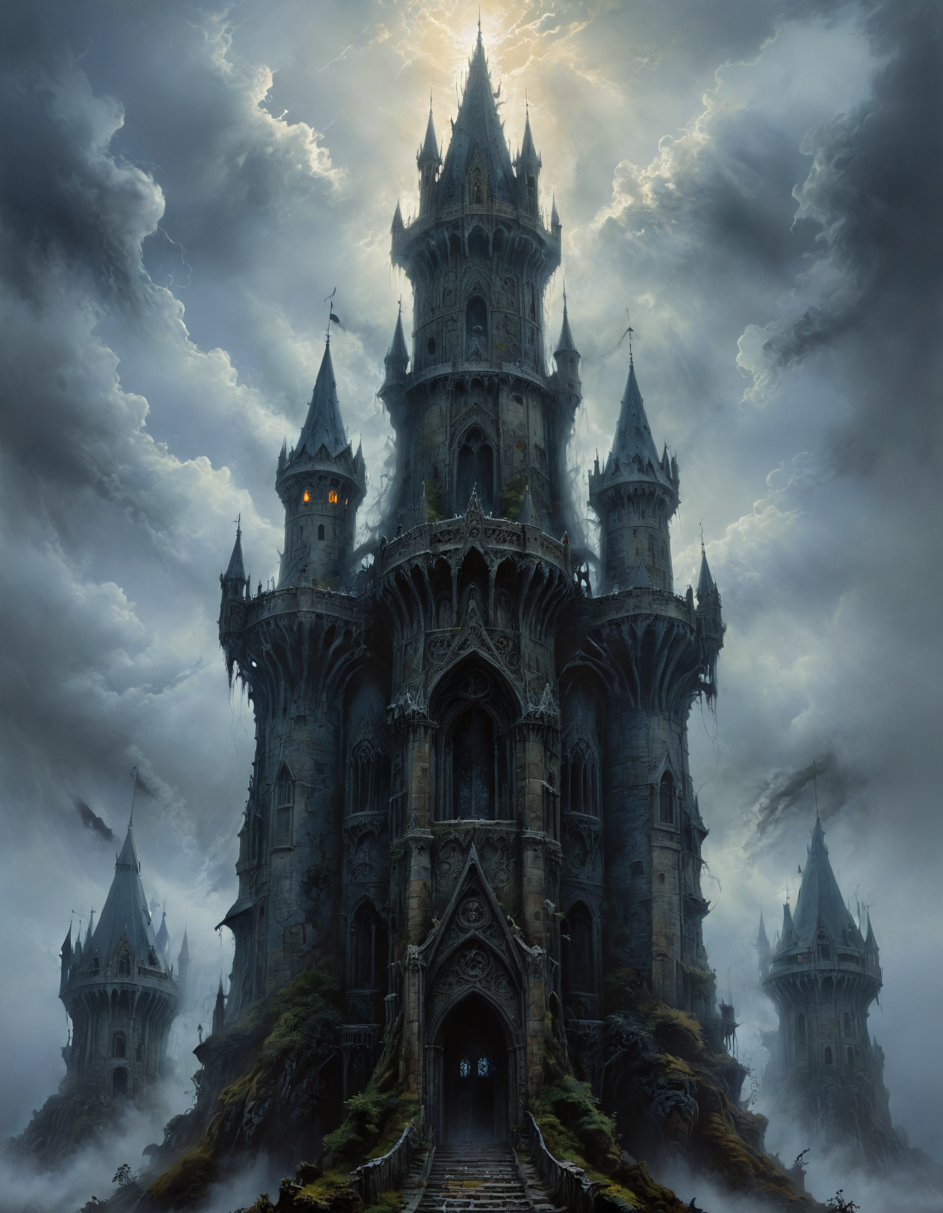Wizards' towers, reaching for the heavens, mysterious, towering, shrouded in mist ([by Alexander Millar: by Patrick Woodroffe: 0.5]:1.3), Gothic fantasy, dark atmospheres, intricate patterns, haunting imagery (masterpiece, intricate details:1.2) <lora:xl_more_art-full_v1:0.5> <lora:add-detail-xl:1> <lora:RMSDXL_Creative:2> <lora:NicolaSamori:0.5>