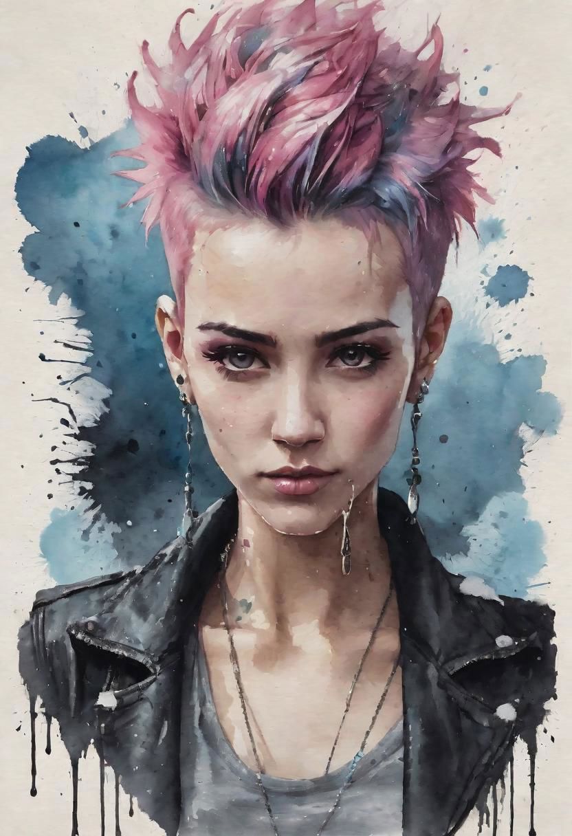 Portrait of punk girl with pink mohawk haircut, half-turn, grunge, eyes, choker,photorealism,cute, pixel elaboration,high detail,lots of details,dynamic, bohemian,elegant,aesthetic, realistic, high quality, work of art, hyperdetalization, professionally, blue haze, paths, snow