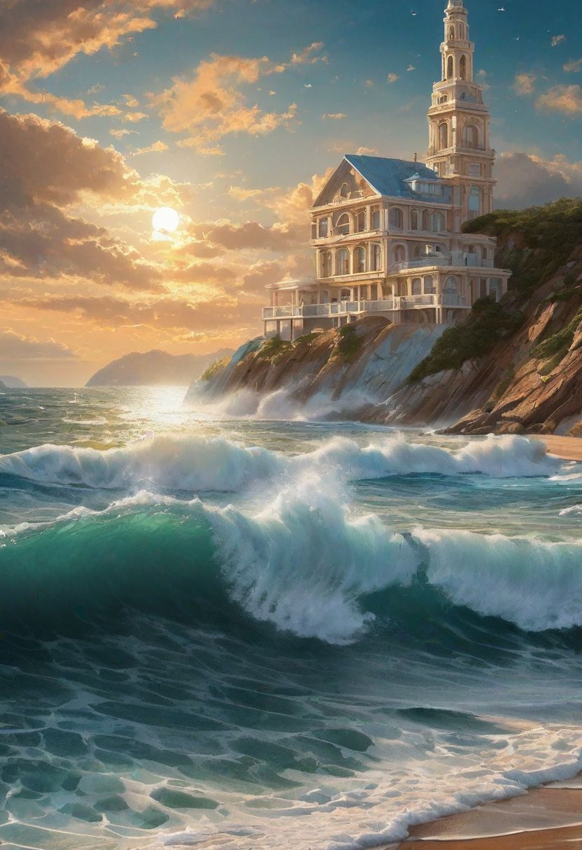 The waves of the sea dance under the sun... sparkle like scattered diamonds... a solitary seagull glides high... cut the sky in a majestic silence."... surrealism, RENE' MAGRITTE style, suggestive, mysterious, 3D, double exposure, multilayer, mixed collage, masterpiece, soft pastel painting, trend on artstation 8K ultra detailed, sf, intricate artwork masterpiece, ominous, matte painting movie poster, golden ratio, trending on cgsociety, intricate, epic, trending on artstation, by artgerm, h. r. giger and beksinski, highly detailed, vibrant, production cinematic character render, ultra high quality model
