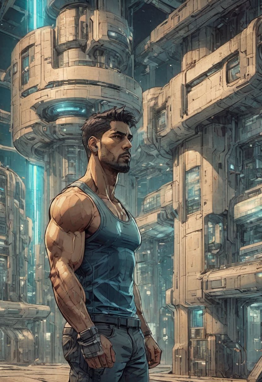 pessimistic utopian brutalism, ink illustration on parchment, anime style, cinematic color grading, midnight, a handsome muscular masculine manly brawny powerful perfect 25-year-old medium-brown-skinned latino man wearing a (tank top:1.3) standing at the edge of a bustling cyberpunk utopia, short hair, short beard, deep color, extremely detailed