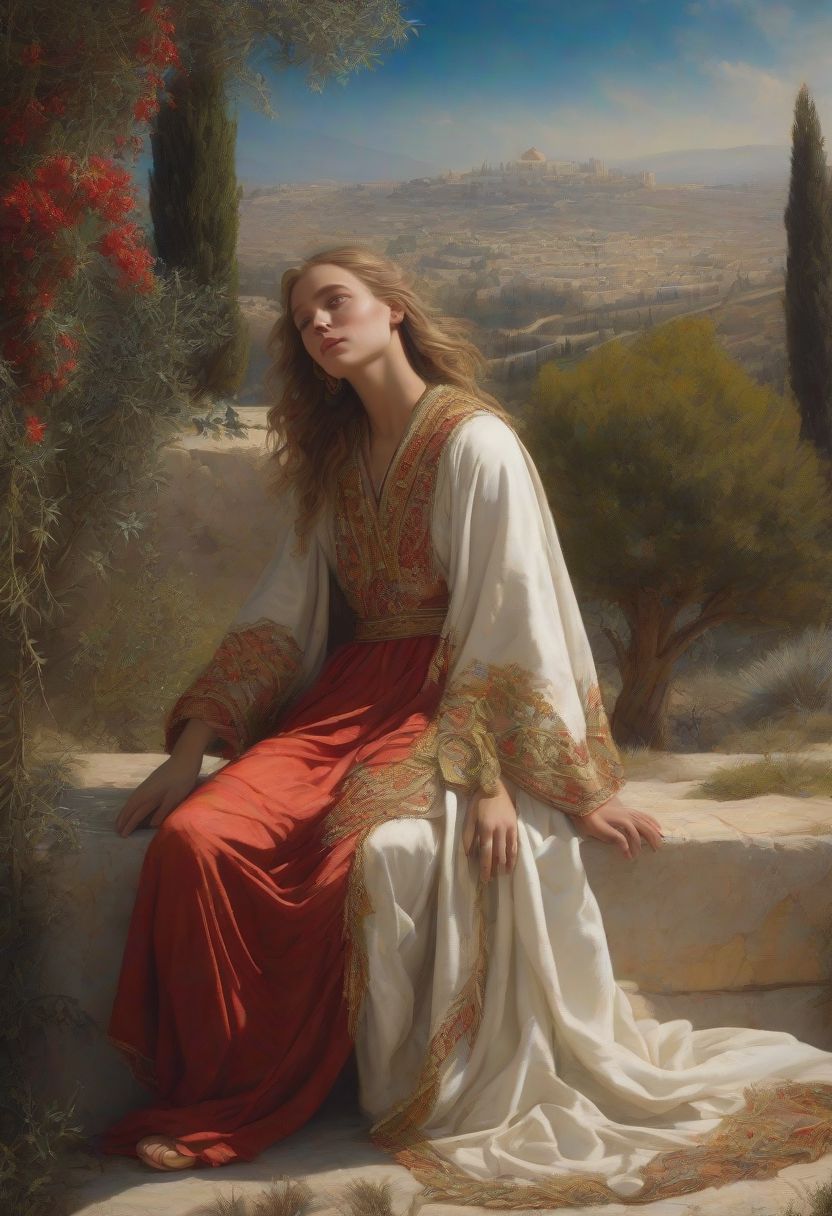 An awe-inspiring and highly detailed conceptual art painting of the Angel of Death. Seated majestically on the Mount of Olives, the female figure exudes an otherworldly presence. Her intricately detailed eyes, nose, and mouth are perfectly aligned, while her face is adorned with minute and fine details, creating a sense of true definition. She wears a white robe with a red silk crossover hem draped over her shoulder, and her well-defined sandals are reminiscent of the time period. The background is a breathtaking representation of shrubs, flowers, and olive trees, painted with fresh and vibrant colors to create an impactful visual. The image has been meticulously refined and polished, with sharpness and detail visible in every inch of the space. Captured at an astounding resolution of 120k, this HD