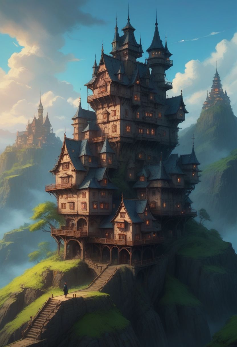 On the Edge of the Unknown Moving Castle , portrait, highly detailed, digital painting, artstation, concept art, sharp focus, illustration, cinematic lighting,