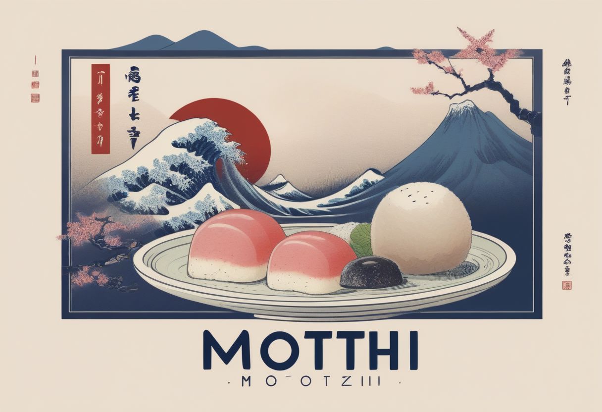 mockup of the poster of the Japanese restaurant "Mottii", the restaurant is named after the Japanese dessert Mochi, on top there is an inscription with the name of the restaurant "Mottii", Japanese engraving style, design by Katsushiki Hokusai, minimalism, close-up, super realistic, 4K resolution,