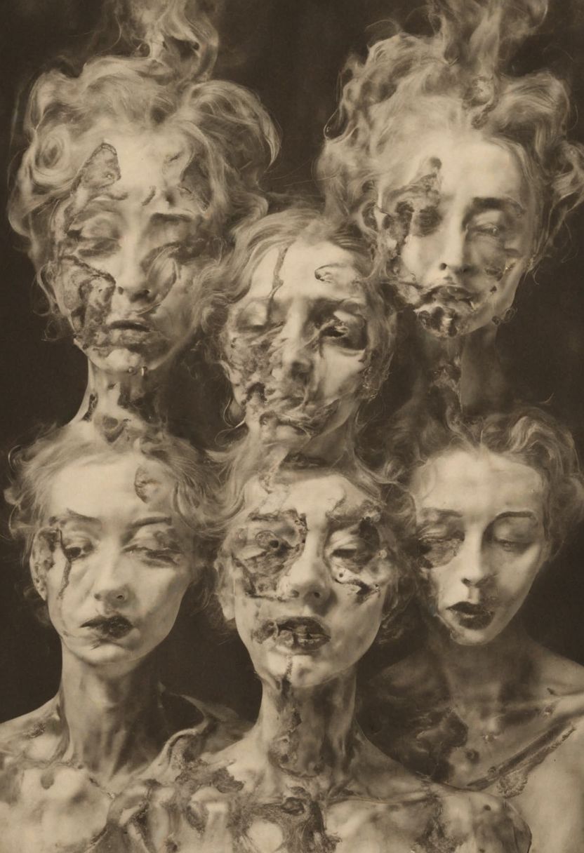 <lora:SDXL_distortion_Sa_May:1>, <lora:V1nt4geKn0ck3rs_v2:0.5>, specular distortion, cursed complex sepia psychedelic painting of a woman with multiple heads, she is disguised in clown, evil look on her face, ants are serving her ice creams, the world is freezing, nuclear wasteland