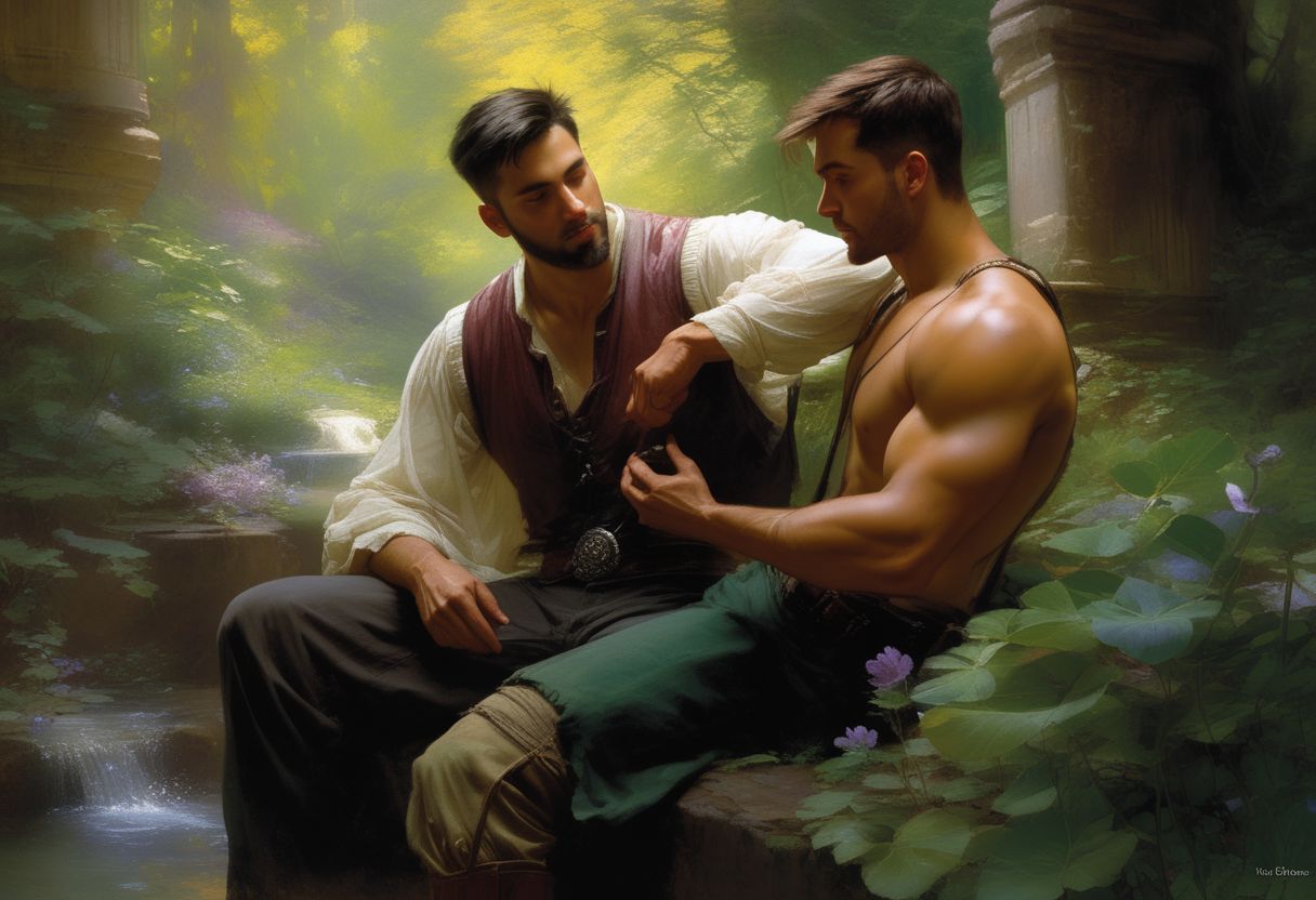futuristic epic fantasy, science fiction, high-tech, dynamic, magical. a homoerotic, homoromantic, gay, loving, exciting, steamy, magnificent, sensual, visceral, amazing, sexy, intense, dramatic masterpiece (by Daniel F Gerhartz|Gaston Bussiere|Maximilian Pirner:1.9) of two men deeply in love, named R and M. M and R are both in their early 30s, extremely attractive, virile, powerful, masculine, hairy, strong, desirable, hunky, and manly. M and R are wearing futuristic clothing resembling Robin Hood. a warm, gentle, tender, loving, comforting hug. R is a short, brown-skinned, muscular, iraqi man, with very short hair, and a perfect beard. He is shorter than M. M is a tall, dark-tan-skinned, athletic, mexican protector, with very short hair, and a short beard. He is taller than R. The setting is indoors. the time is midnight. it is many years in the future. The overall mood is provocative, passionate, expressive, sensual, magical, and visceral, evocative of gay romance, gravitas, and love. extremely detailed, soft romantic lighting, romantic mood, romantic atmospheric, shadowplay, vignette.
