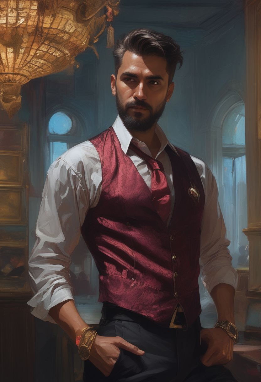 extremely detailed masterpiece (by Daniel F Gerhartz|Sam Guay|Maximilian Pirner]. fantasy, sci-fi, futuristic, high-tech. a 28-year-old Iraqi man in a populated ballroom. He wears a revealing, ornately-embroidered, burgundy, v-neck shirt, as well as a simple necklace. His appearance is (muscular:1.9], (extremely-hairy:1.8], manly, and roguish, with massive hairy pectorals, a dark very_short_undercut, an unshaved, perfect, stylish, short, neatly-trimmed beard, and mahogany-toned skin. He personifies mischief, danger, intrigue, and mystery.