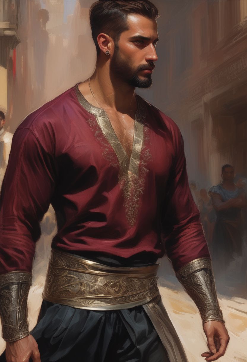 extremely detailed masterpiece (by Daniel F Gerhartz|Sam Guay|Maximilian Pirner]. fantasy, high-tech. a 28-year-old Iraqi male aristocrat walking through a populated ballroom. He wears a tight, revealing, ornately-embroidered, burgundy, v-neck shirt; and a simple, plain necklace. His appearance is (muscular:1.9], (extremely-hairy:1.8], manly, and roguish, with massive biceps; a dark very short undercut; an unshaved, perfect, stylish, short, neatly-trimmed beard; and mahogany-toned skin. He personifies mischief, danger, intrigue, and mystery.