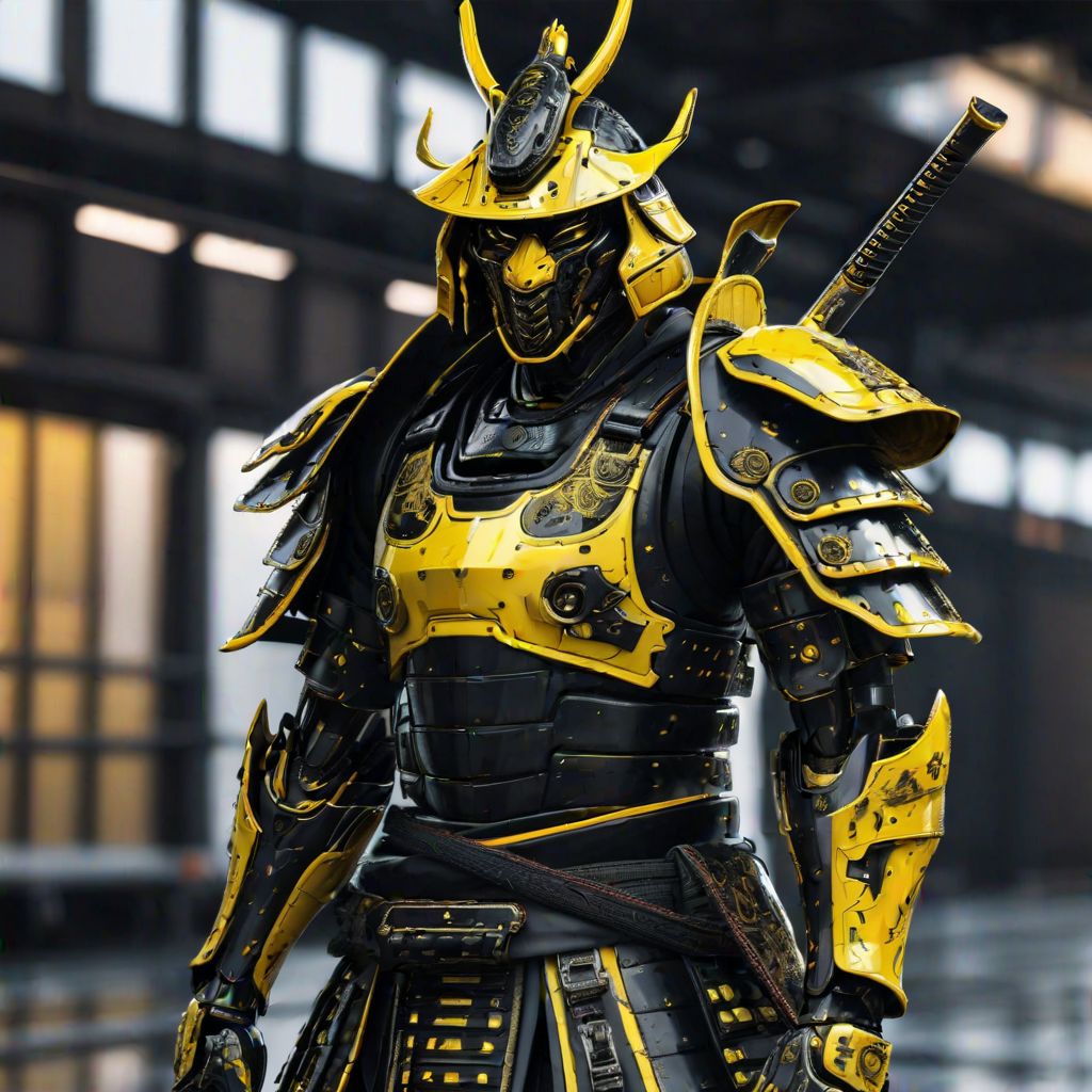 cybernetic samurai, armor, realistic, 8k, black with yellow trim,
