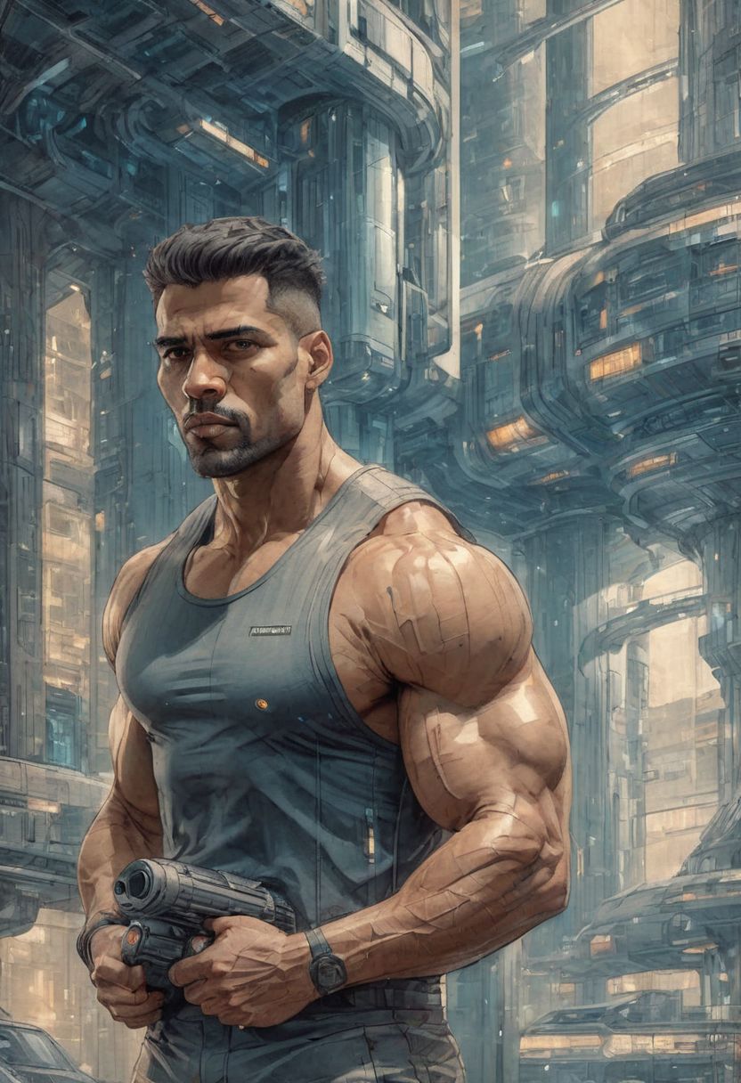 pessimistic utopian brutalism, graphite illustration on parchment, cinematic color grading, midnight, a handsome muscular masculine manly brawny powerful perfect 25-year-old medium-brown-skinned latino man wearing a (tank top:1.3) standing at the edge of a bustling cyberpunk utopia, short hair, short beard, deep color, extremely detailed