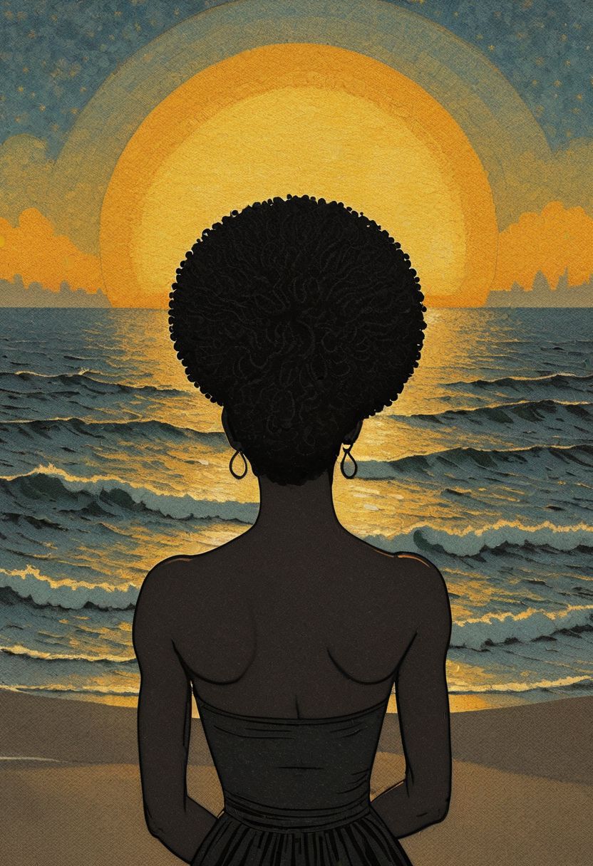 Una bellissima doppia esposizione che combina la silhouette di una donna nera con i capelli afro con la costa del tramonto, la costa del tramonto dovrebbe fungere da sfondo sottostante, con i suoi dettagli incorporati nella dea, linee nitide, lo sfondo monocromatico, messa a fuoco nitida, doppia esposizione, colori fantastici,van Gogh stile Nascondere