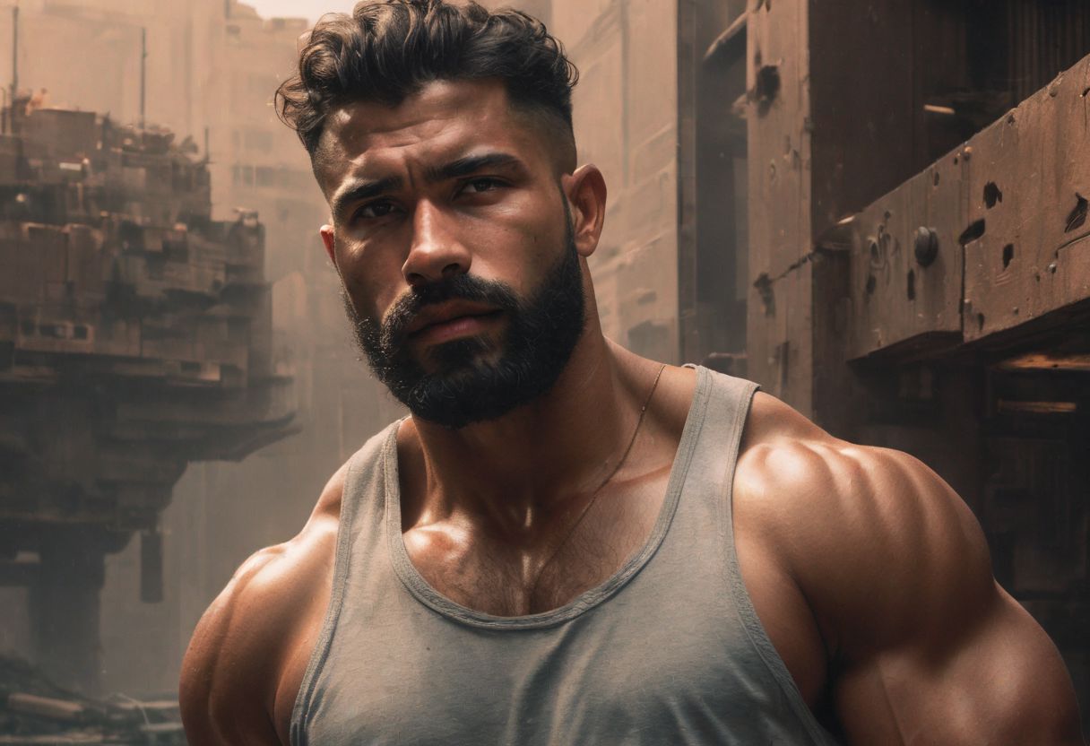extremely detailed glossy oil on canvas portrait (by guillaume seignac:1.1) of a hairy handsome muscular masculine manly brawny powerful perfect 26-year-old mahogany-skinned (doctor:1.2), bare arms, sleeveless, medium-short spiky hair, (short beard:1.5), outdoors, a lush jungle next to a hospital at the edge of the universe, utopian technobrutalist fantasy, cinematic color grading, golden hour, deep color, rich color, masterpiece, perfect composition, smooth lines, perfection, breathtaking, amazing