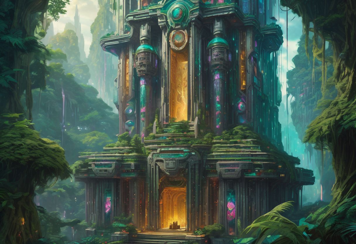 epic technobrutalist utopian fantasy, oil on canvas, cinematic color grading, a bustling fantastical temple in the jungle, extremely detailed masterpiece, by Guillaume Seignac