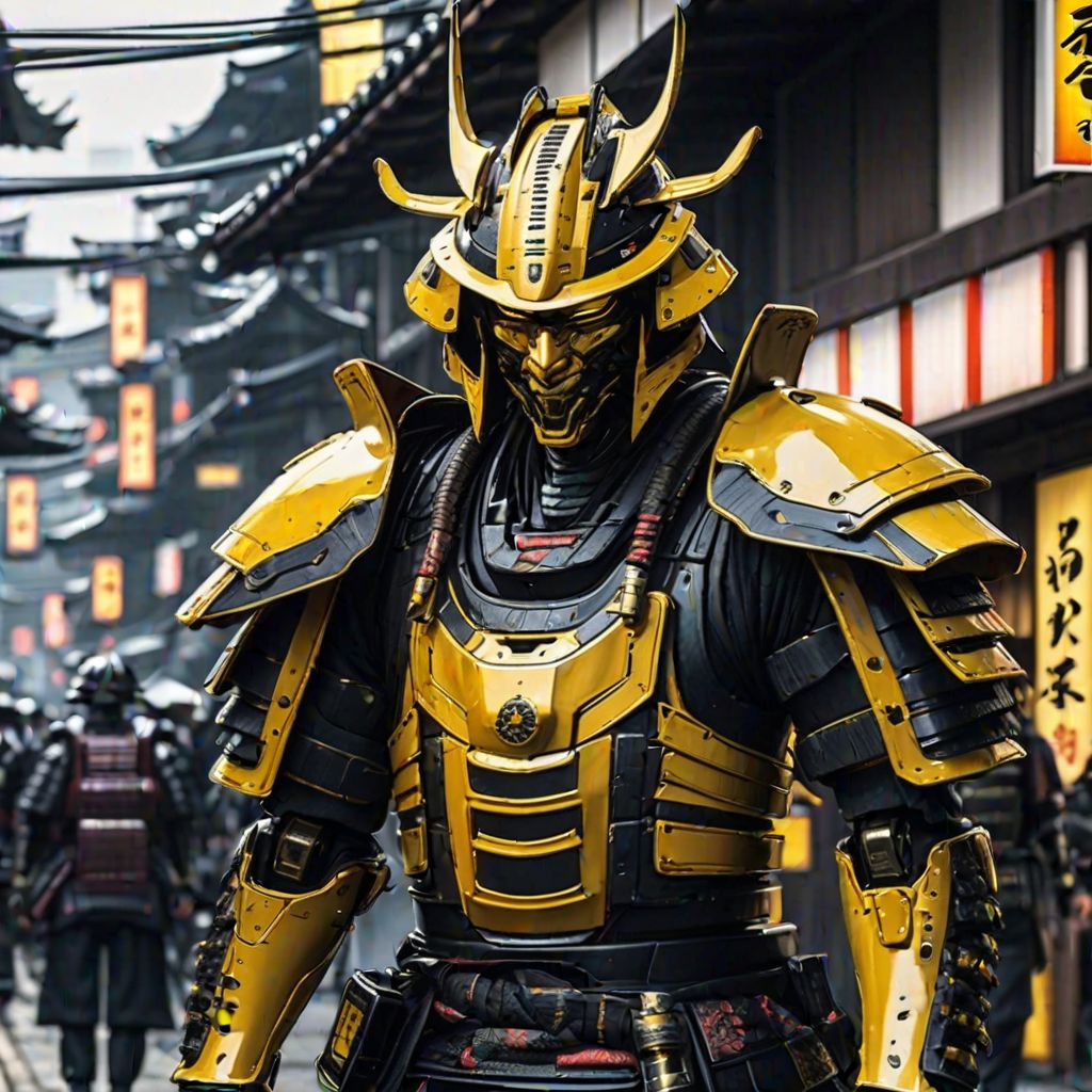 many cybernetic samurai, armor, realistic, 8k, black with yellow trim, Japanese city street, war, fighting