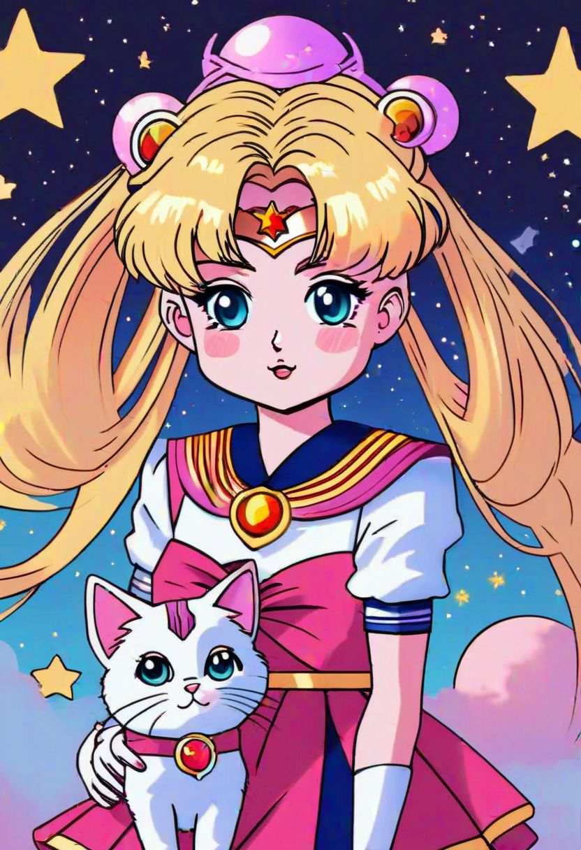 masterpiece, high quality, chibi art of Sailor Moon holding a cat in Chibi art style,with colorful hairs and clothes,beautiful stars <lora:J_pastel_color:0.8> j_pastel_color