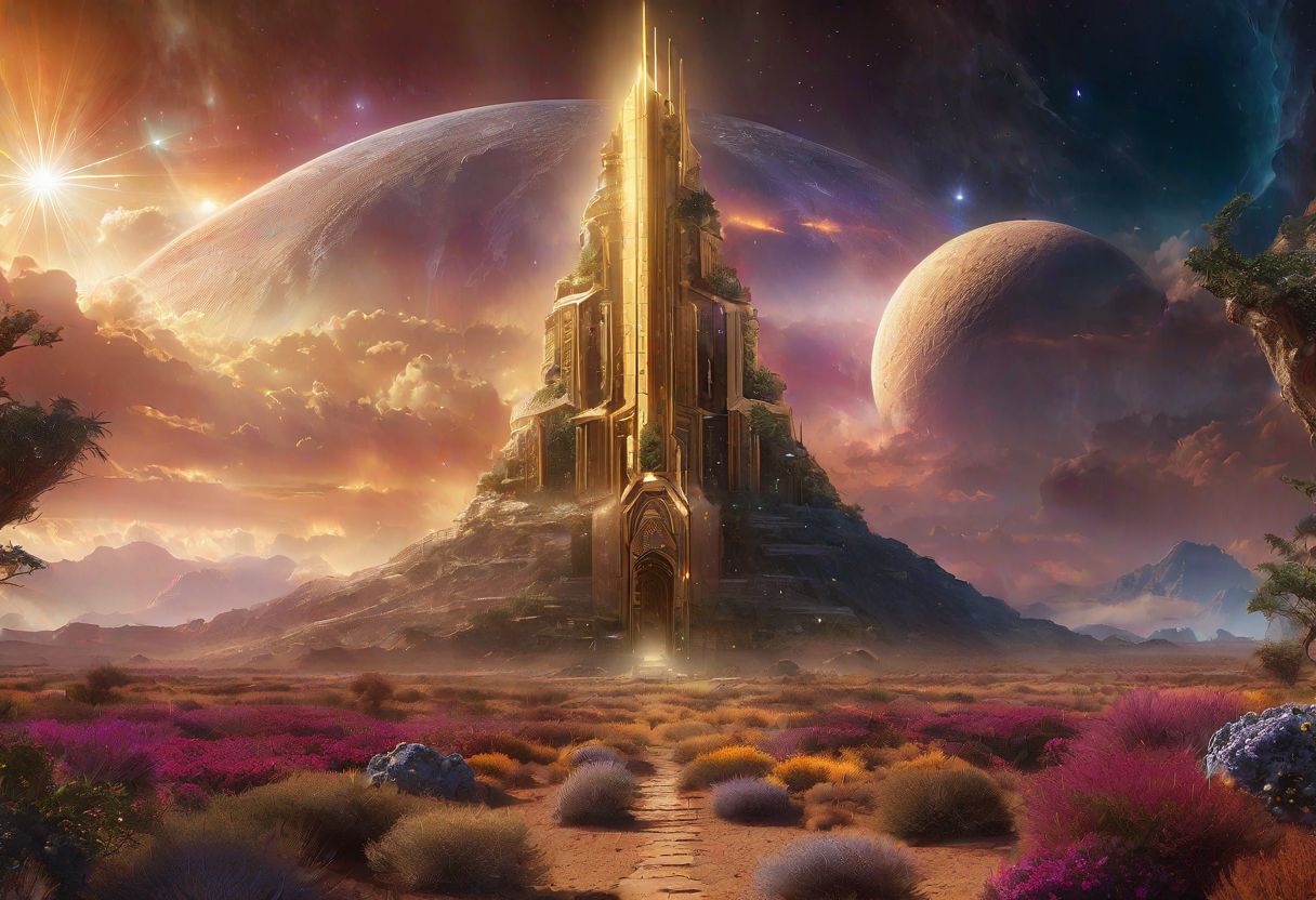 epic visual effects, detailed, scifi, vibrant colors, cosmic art, cinematic scene, dramatic lighting, a gold-plated tower in the distance rising into the clouds, surrounded by a small garden, arid landscape, moons in the background, god rays,