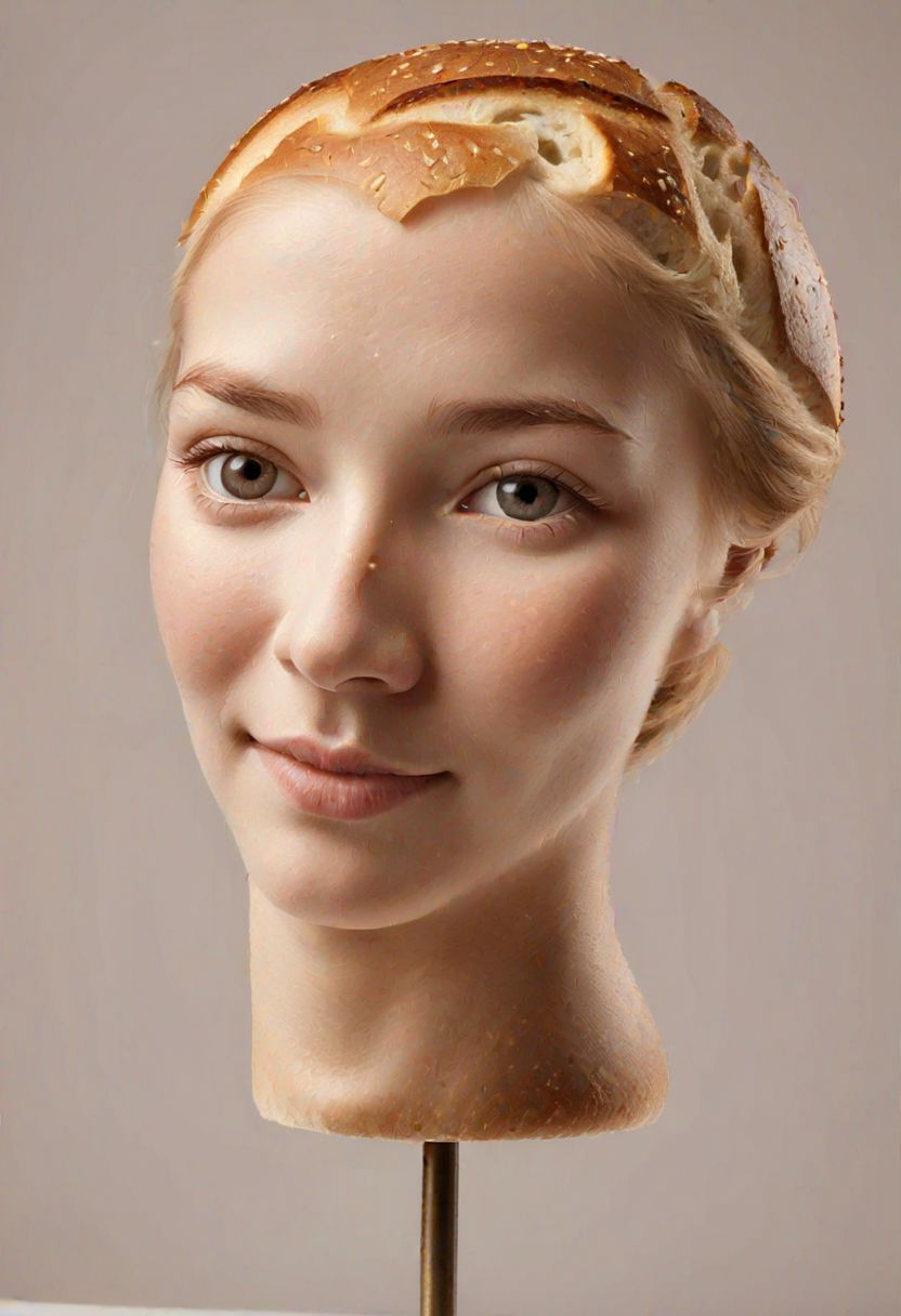 A delicious, artisanal loaf of bread that looks like the face of a beautiful 18-year-old European woman. The bread has a rich, golden-brown crust with a slight shine, and the features are delicately crafted on the surface. The eyes are two small indentations, the nose is a gentle curve, and the mouth is a slit that runs across the bread. The overall presentation is artistic and whimsical, with a touch of humor and a sense of culinary creativity.