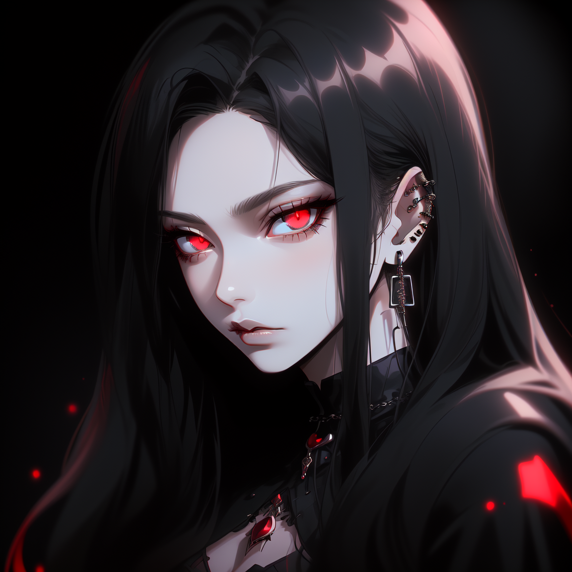 Goth girl, Goth girl 1girl ,1girl, solo, long hair, pale skin, black hair, jewelry, closed mouth, black clothes, lips, red eyes, glowing eyes, detailed eyes, piercing, portrait, , earrings, dark background, simple background, <lora:Goth_girl-v2S:0.8>.