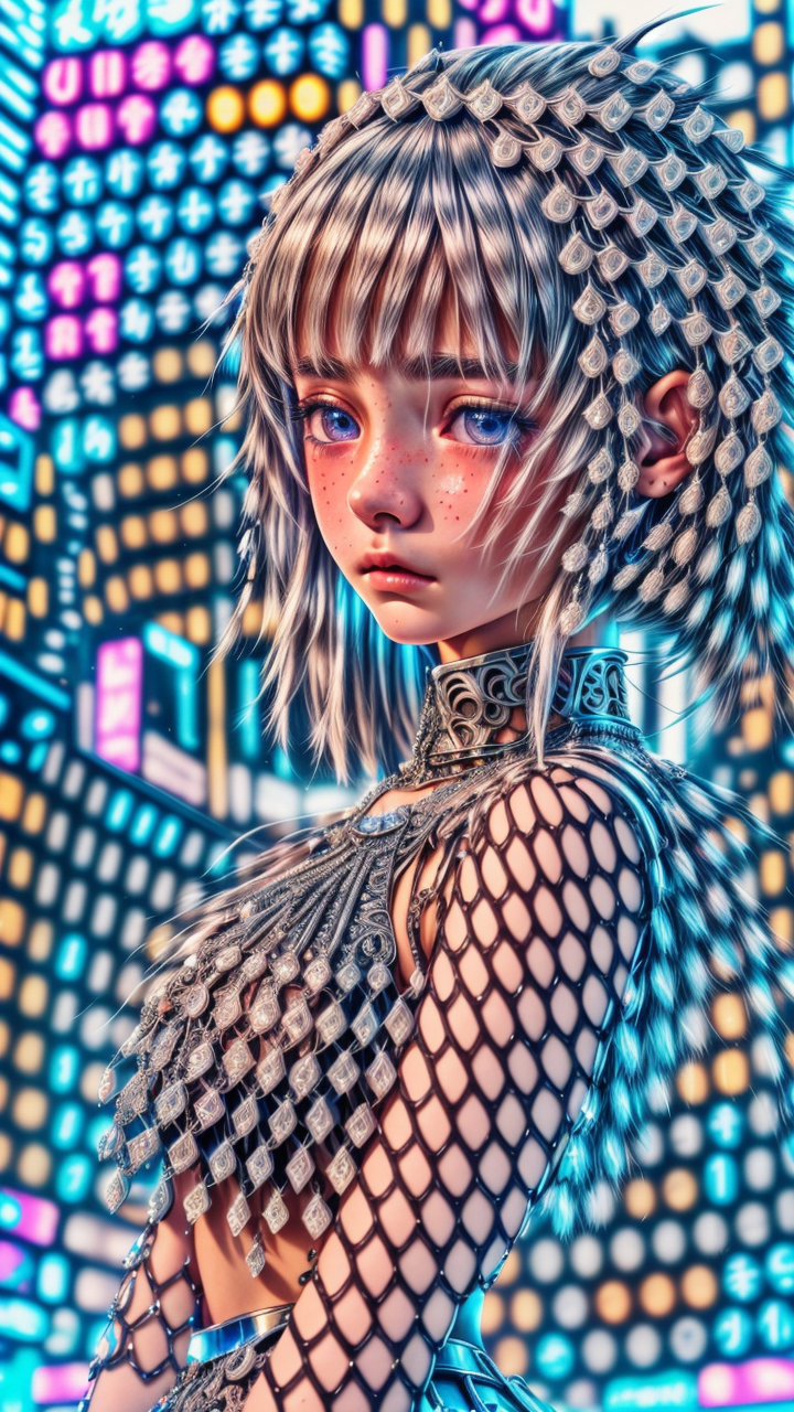 (best quality, highly detailed, intricate, photorealistic:1.2), close up, (detailed skin, detailed eyes:1.1), portrait of a (shy confused teenage girl:1.3) that lost in huge night city, fancy outfit, cyberpunk, cinematic <lora:more_details:0.7>