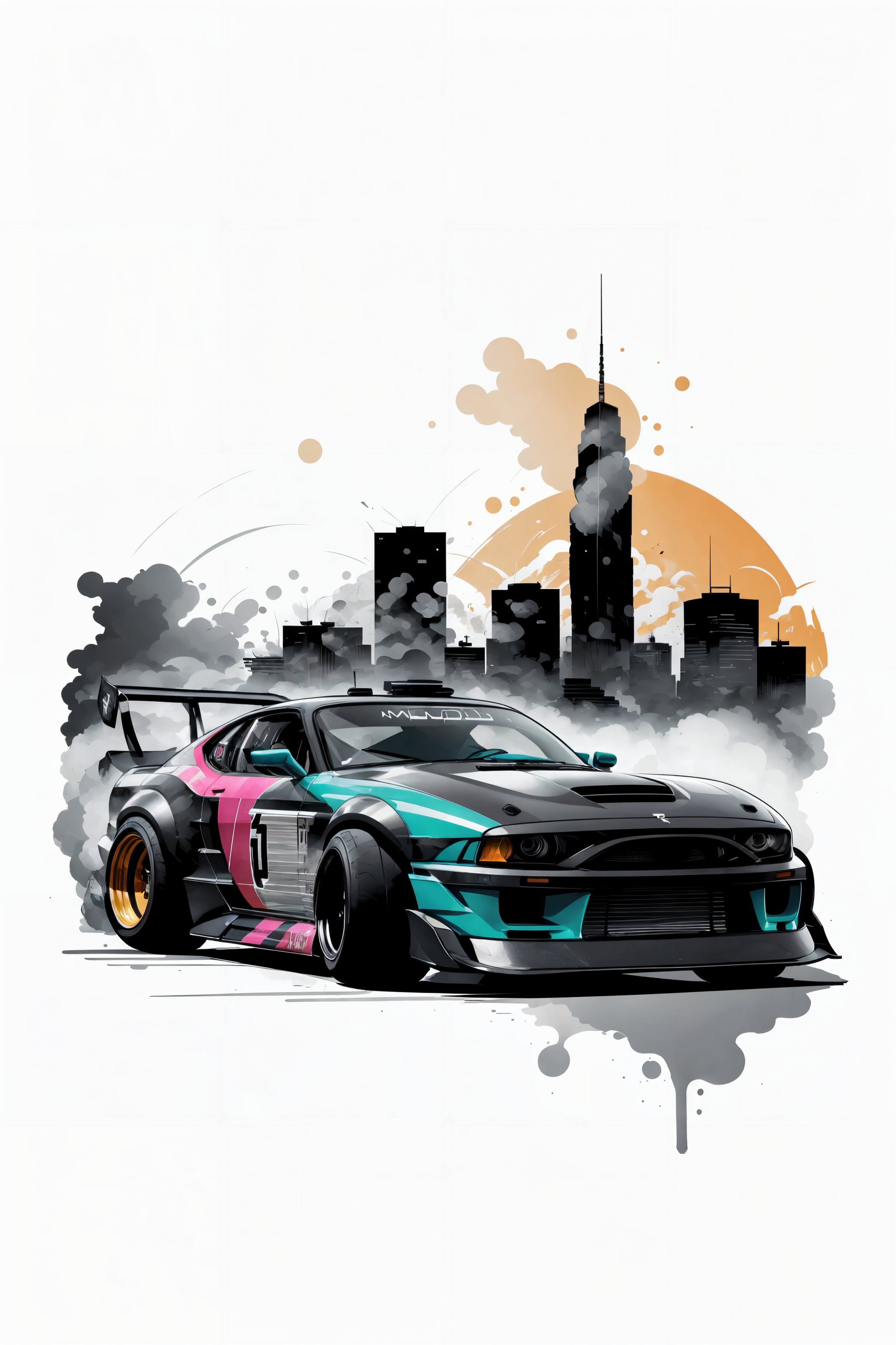 Vector illustration, scenery, ink, pop art, sketch, cardrifting, smoke, burn, 1 car, tuned JDM car, wide fenders, big rims, slammed, (drifting:1.2), on the road, (city:1.3), (skyscrapers:1.1), <lora:cardrifting:1.15>, <lora:zeekars:0.45>, <lora:ink-0.1-3-b28-bf16-D128-A1-1-ep64-768-DAdaptation-cosine:0.75>