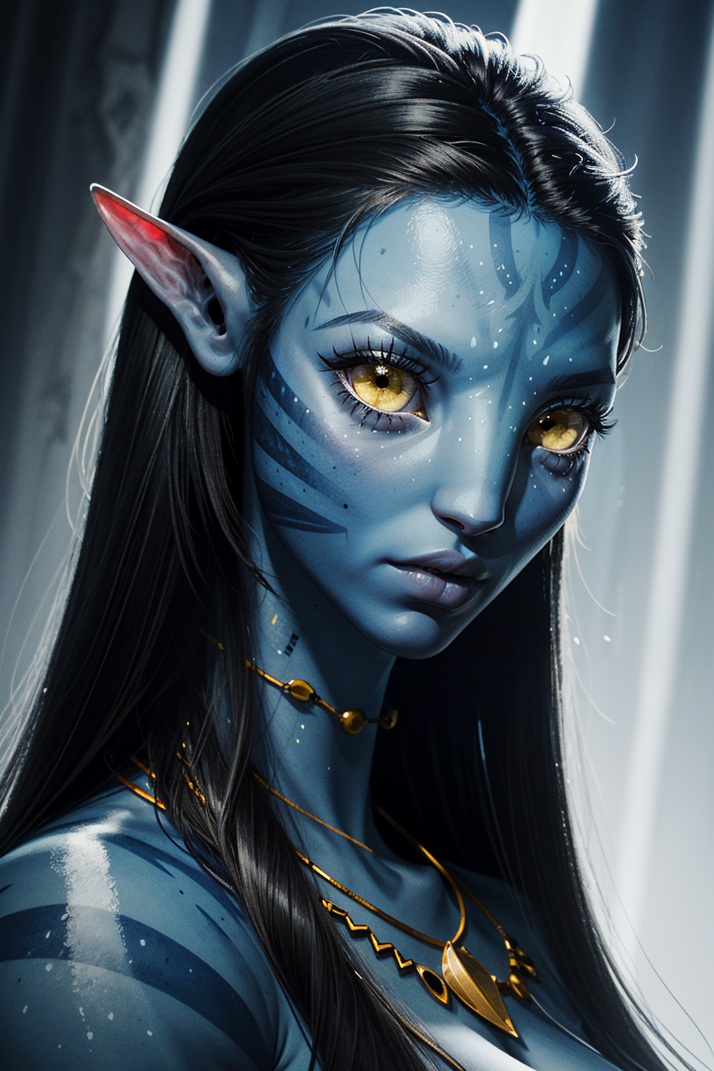 ((ultra detailed, masterpiece, best quality)) <lora:AvatarNeytiri-000009:0.9> AvatarNeytiri, 1girl, solo, black hair, yellow eyes, blue skin, jewelry, portrait